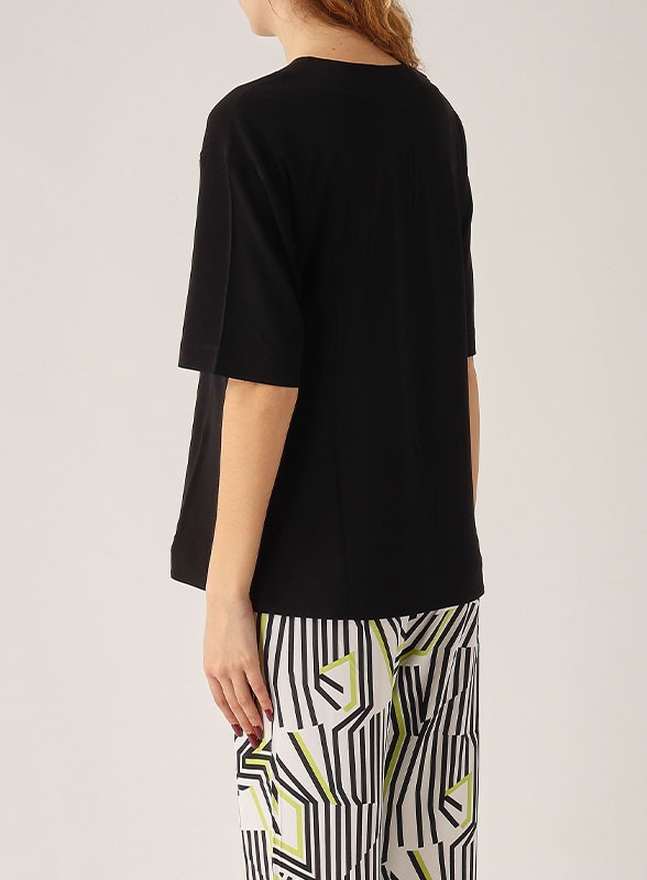 Top firmato Marella in cotone stretch con cristalli cabochon ricamati sul davanti. Fit aderente e scollo stondato.
