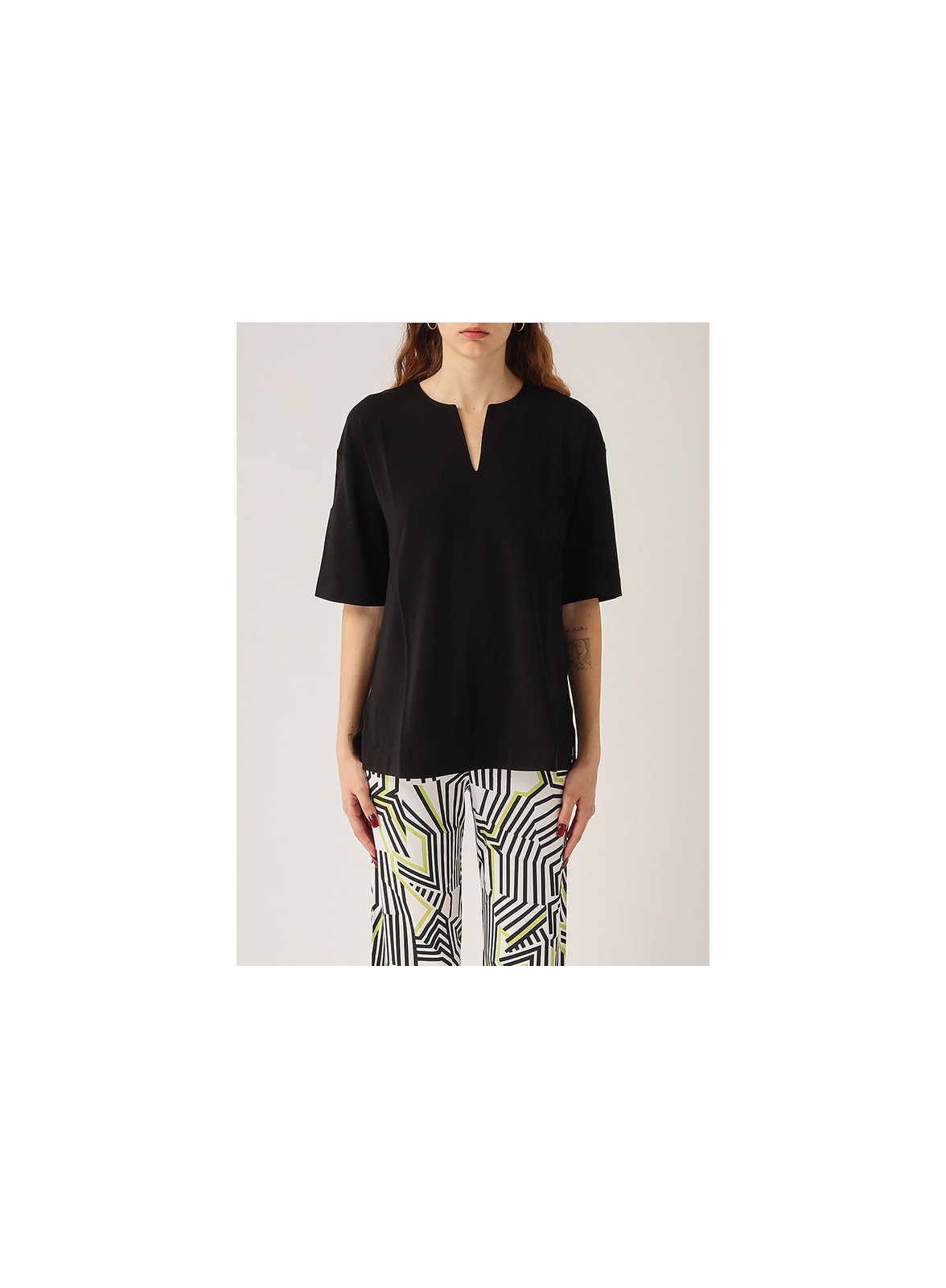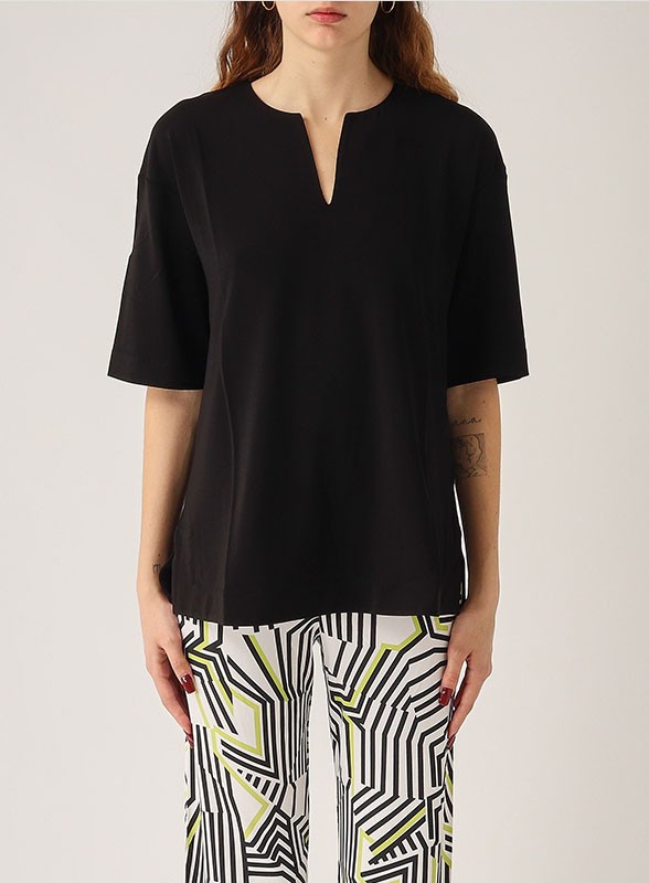Blusa firmata MAX MARA BEACHWEAR realizzata in morbida viscosa stretch, ideale per chi cerca uno stile raffinato e confortevole durante la stagione estiva. Il design presenta un collo a giro con un delicato taglio a V sul davanti, che dona un tocco femminile e sobrio al capo. Le maniche corte a giro basso e i piccoli spacchetti laterali al fondo completano una silhouette morbida, perfetta per accompagnare ogni movimento con leggerezza. Pensata per un look elegante e rilassato, questa blusa si adatta perfettamente sia ad abbinamenti casual che più curati.