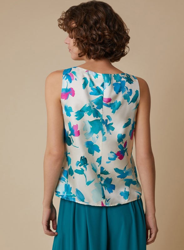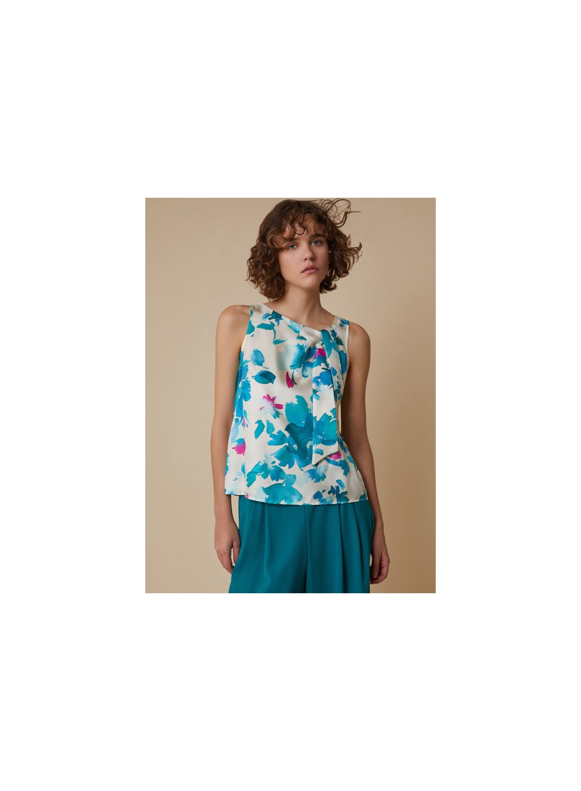 Top firmato PENNYBLACK in pura seta con fantasia floreale acquerellata e nastri sullo scollo. Eleganza firmata per ogni occasione.