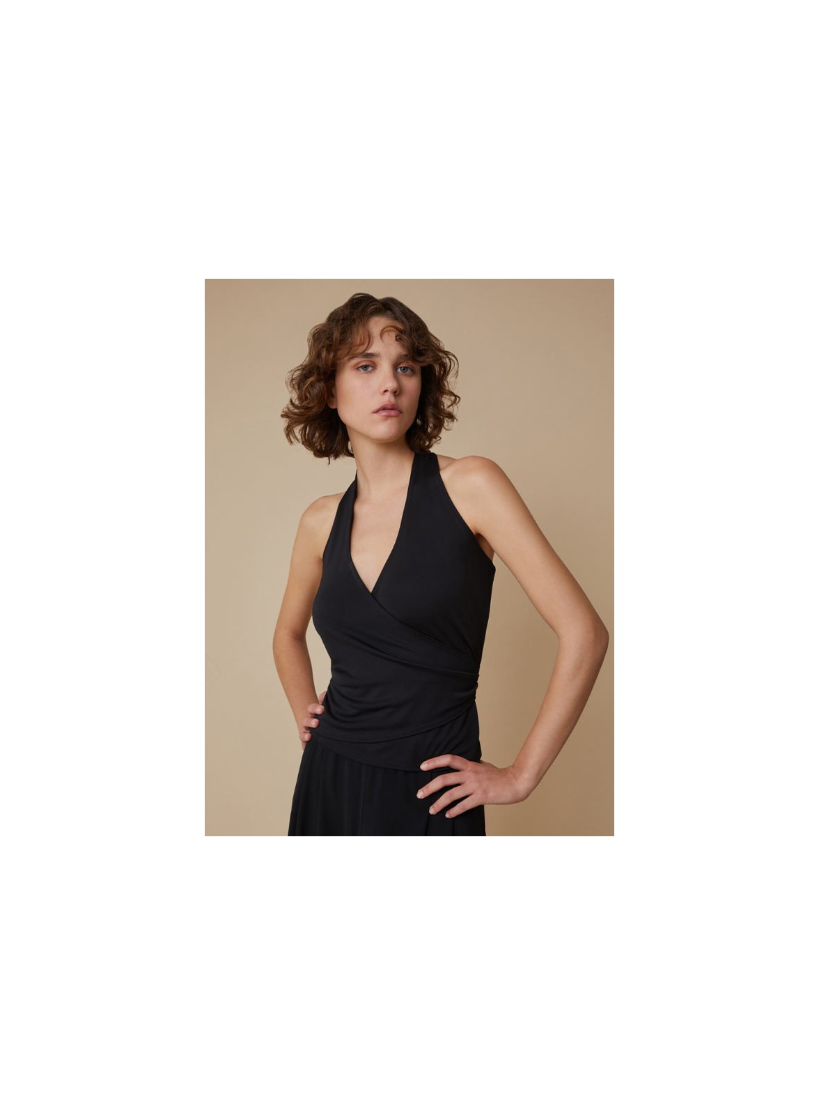Top firmato PENNYBLACK dal design incrociato che esalta con raffinatezza la femminilità. Realizzato in morbido jersey, avvolge la silhouette con un taglio slim che valorizza le forme, mantenendo una linea elegante e pulita. La lunghezza, che si ferma appena sopra i fianchi, lo rende perfetto da indossare sia con gonne che con pantaloni a vita alta. Il dettaglio distintivo è il motivo a torchon in georgette sulla schiena, che scopre le spalle con un effetto delicatamente sensuale, aggiungendo un tocco di sofisticata leggerezza al capo.