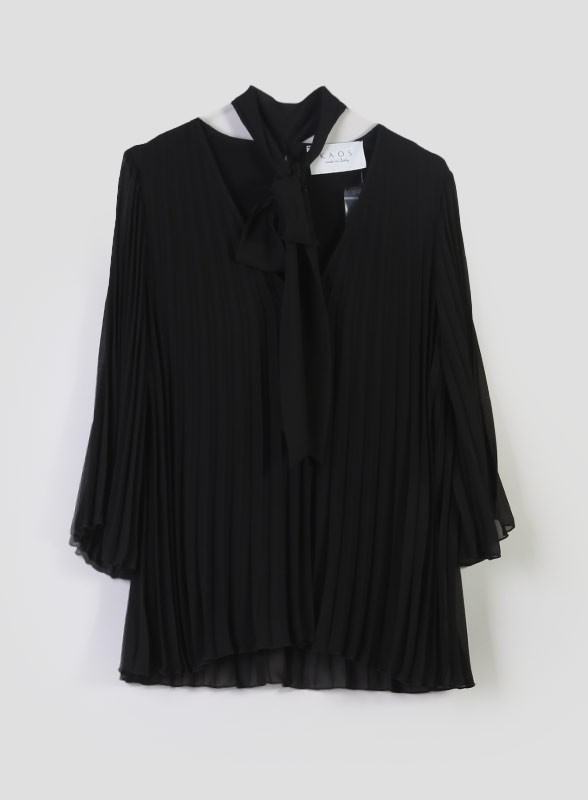 Blusa firmata KAOS in morbido plissé con scollo a V e fusciacca, linea fluida ed elegante, perfetta per ogni occasione.
