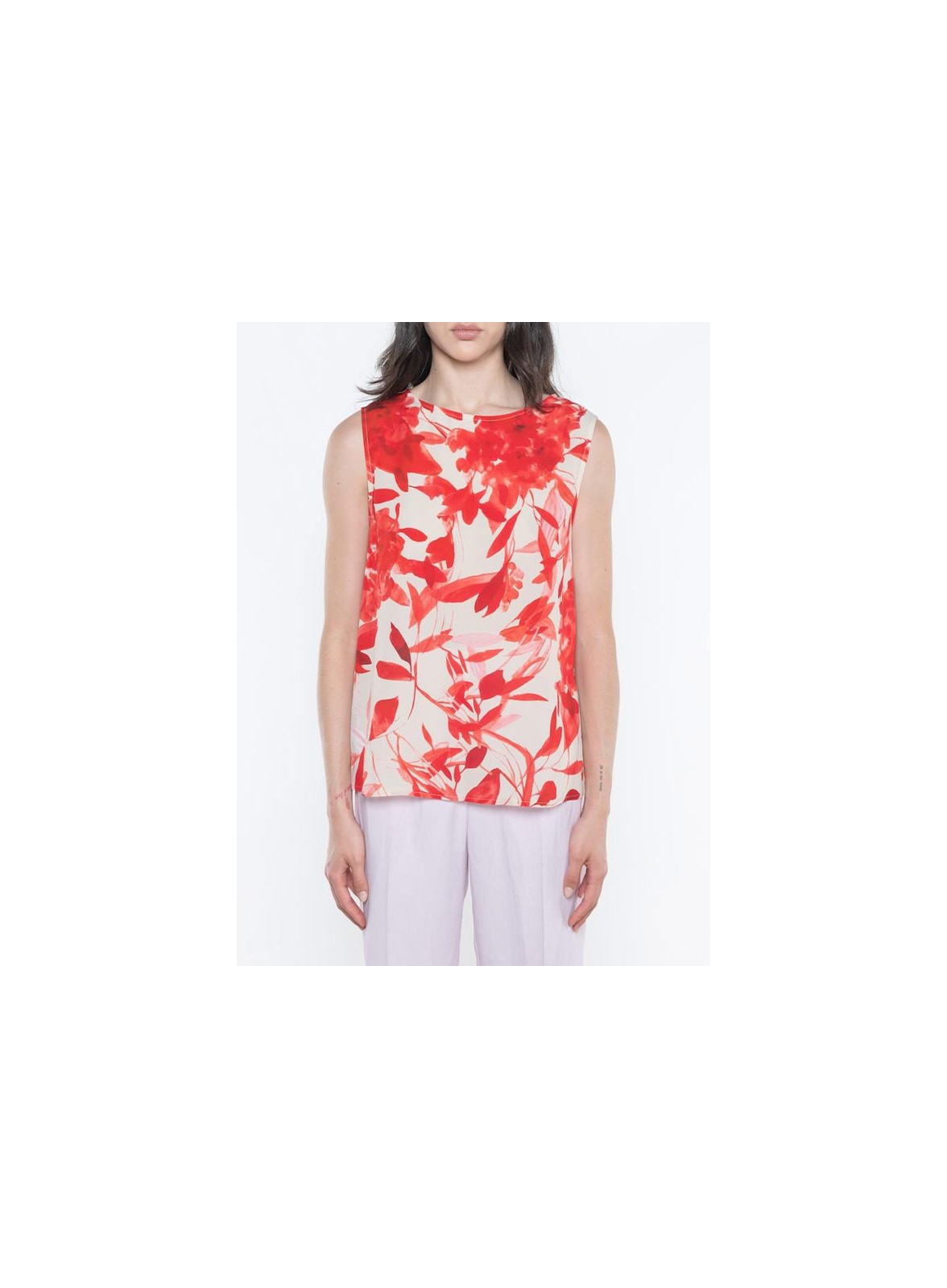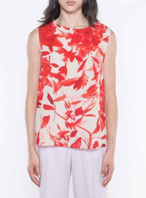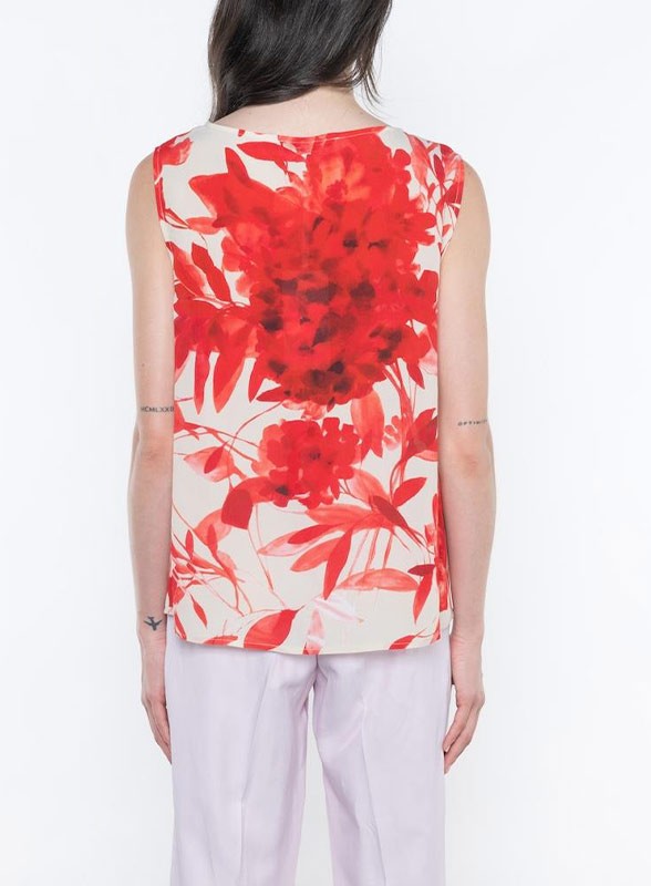 Top firmato KAOS in georgette stampata, con collo a giro e linea morbida. Un capo versatile e raffinato, firmato per ogni occasione.