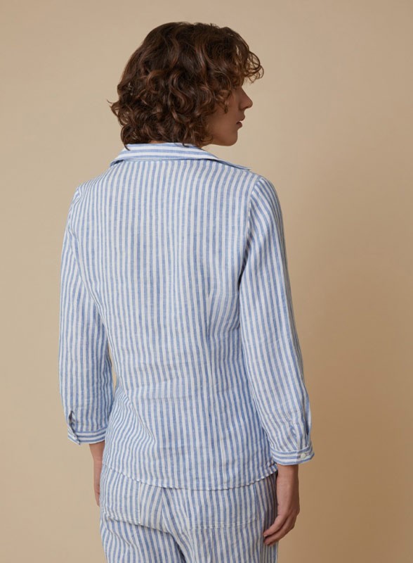 Camicia firmata PENNYBLACK realizzata in tela di puro lino, ideale per un guardaroba estivo elegante e sofisticato. Il taglio slim è definito da pinces sul busto, pensate per valorizzare la silhouette femminile con discrezione e raffinatezza. Lo scollo a V con colletto aperto aggiunge un tocco moderno e leggero, mentre le maniche a tre quarti con polsino garantiscono comodità e versatilità.