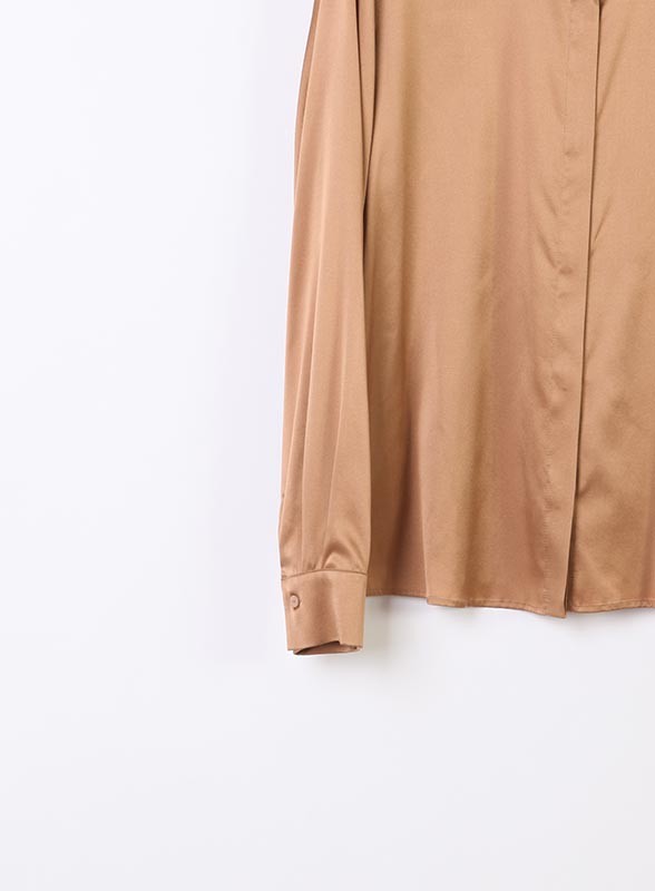 Camicia in raso di seta stretch firmata PENNYBLACK, dalla linea dritta e dal design raffinato, con colletto classico e maniche lunghe chiuse da polsino con bottoncino. L’abbottonatura è nascosta da bottoni in tinta, per un effetto pulito e sofisticato. Perfetta per look eleganti o casual, si abbina facilmente a tailleur sartoriali o jeans.