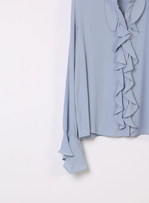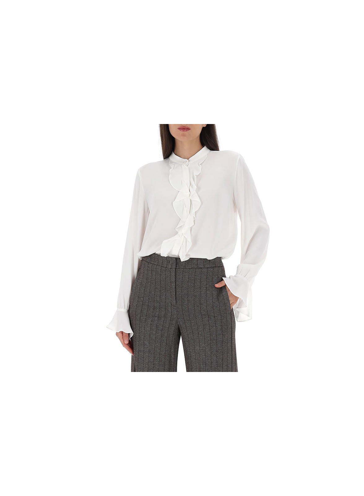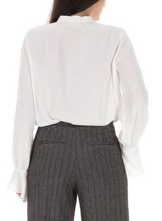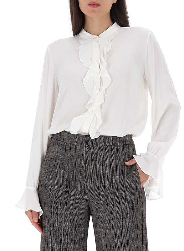 Camicia firmata IBLUES in misto seta, colletto coreana e ruches sul fronte. Eleganza e comfort per ogni occasione.