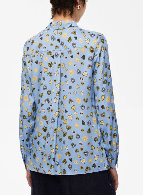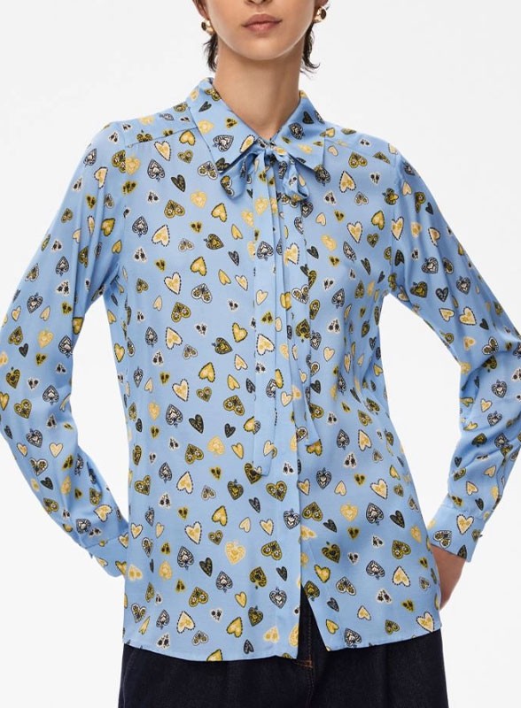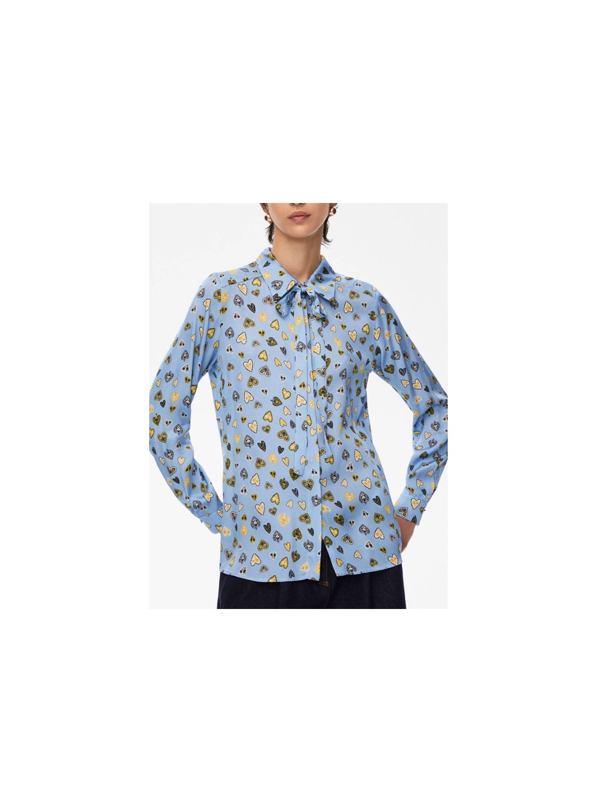 Camicia firmata IBLUES in raso stampato con linea dritta e sciarpina staccabile, un dettaglio chic per look versatili e contemporanei.