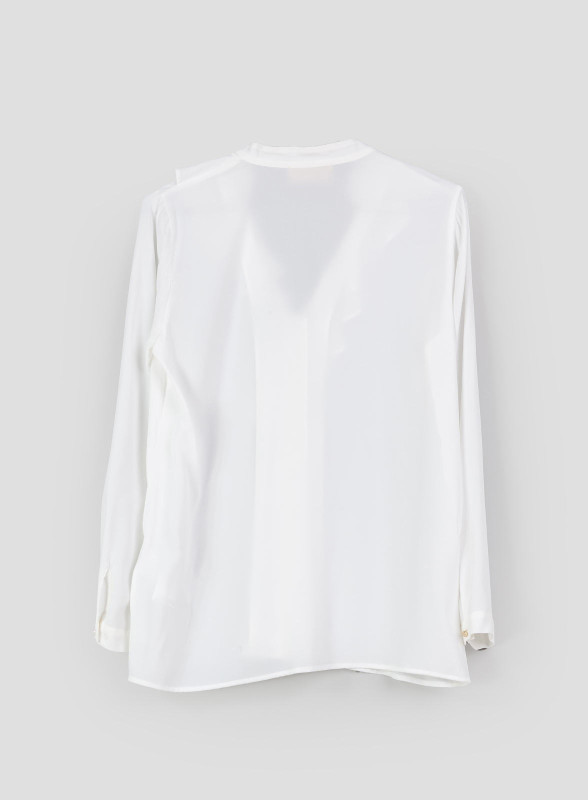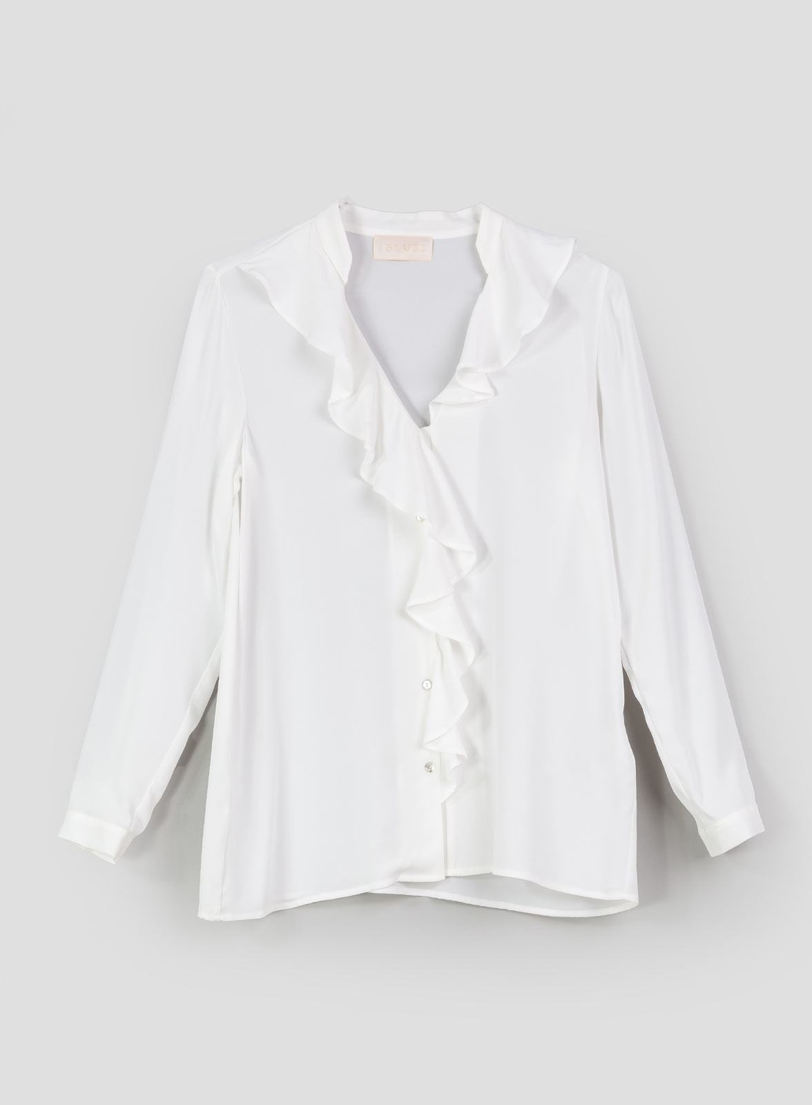 Questa camicia firmata iBlues è realizzata in crêpe de chine misto seta dalla linea morbida. Il modello presenta collo a listino, maniche lunghe, chiusura con bottoni nascosti e decorazione con volant asimmetrico.
