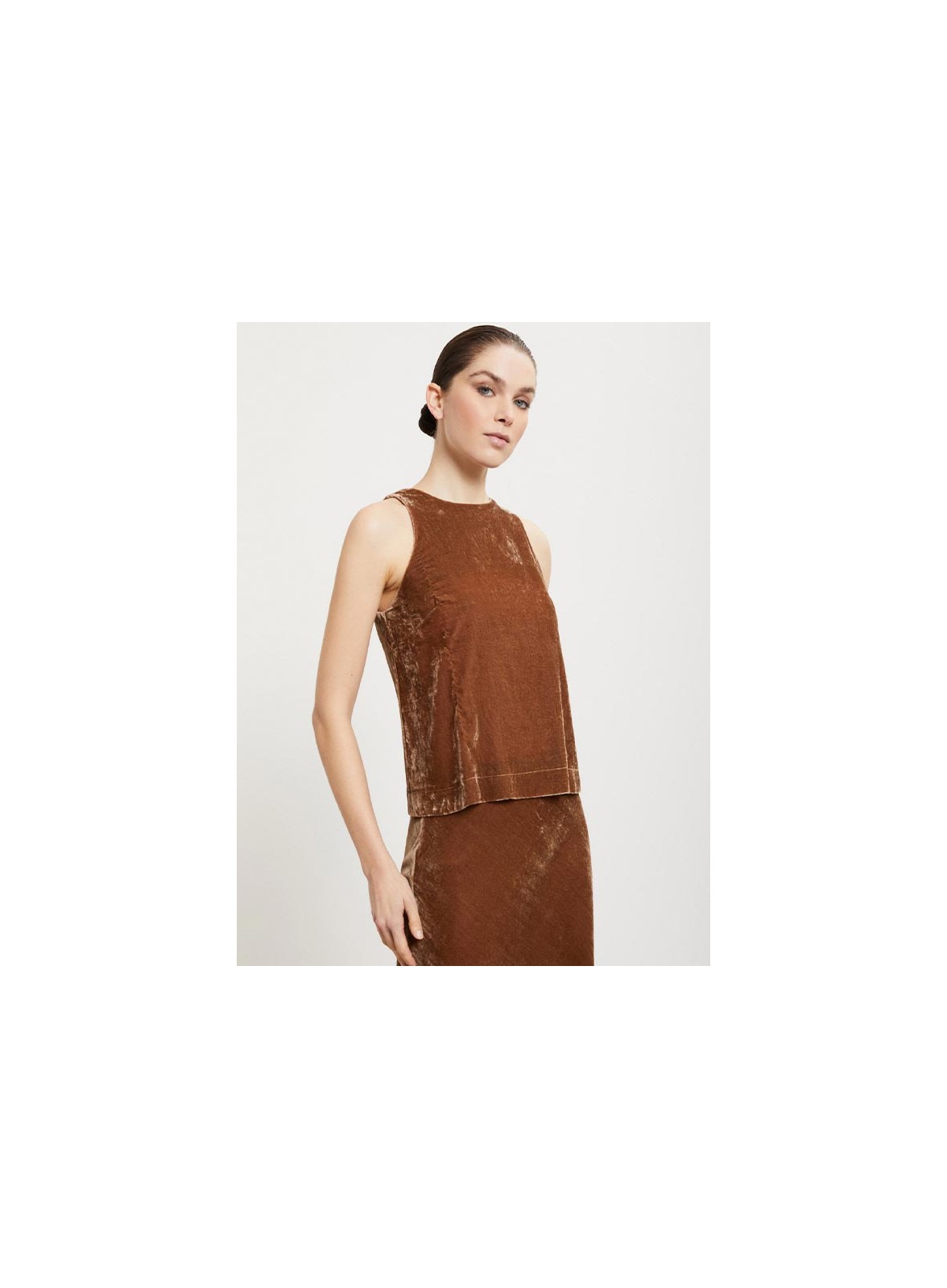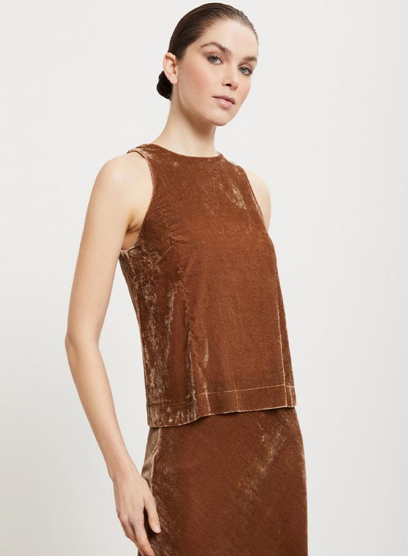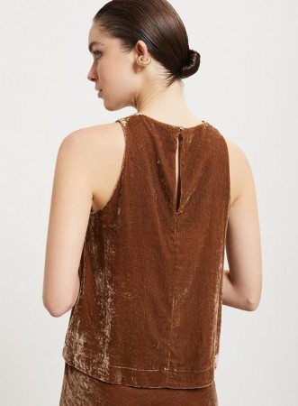 Top firmato OTTOD'AME in micro magliatura di velluto misto rayon, con scollo a V delicato e spalline sottili per un’eleganza essenziale.