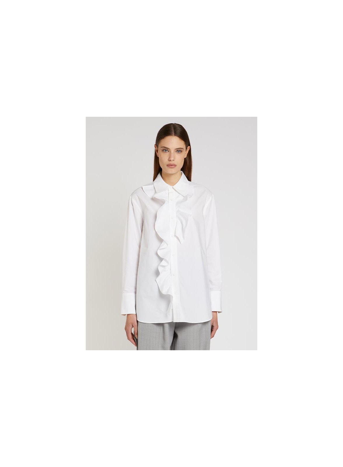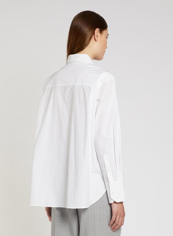 Camicia firmata MARELLA in popeline di cotone con rouche frontale a chiocciola, manica lunga e fit regolare. Eleganza bianca.