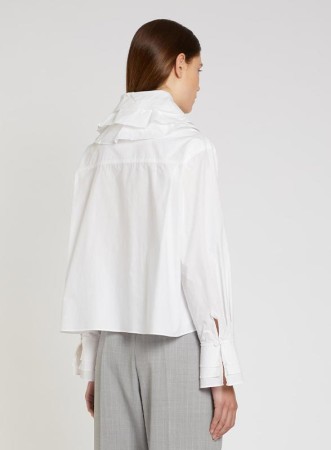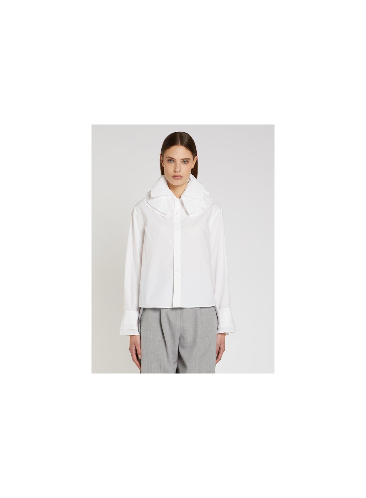Camicia firmata MARELLA realizzata in popeline di cotone, caratterizzata da manica lunga a giro e abbottonatura a uomo. Il design si distingue per l’elegante dettaglio sul collo, composto da strati di tessuto che simulano un fiore mosso, raffinato e contemporaneo. Lo stesso motivo è ripreso sui polsi, creando un equilibrio armonioso tra struttura e femminilità. La vestibilità è regolare, pensata per garantire comfort e valorizzare la silhouette con naturalezza.