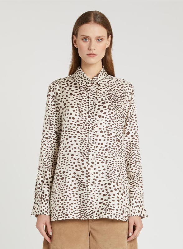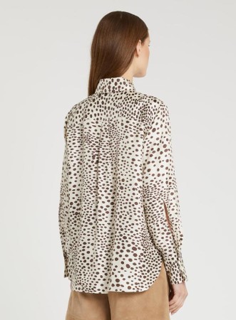 Camicia in twill di seta stampata, firmata MARELLA, dal design fluido ed elegante, pensata per valorizzare ogni silhouette con naturale raffinatezza. Il modello presenta collo classico a camicia, abbottonatura frontale a vista e polso alto con due bottoni, dettagli che ne definiscono lo stile ricercato. Sul retro è rifinita con carrè e cannoncino che donano movimento e una vestibilità regolare, perfetta per accompagnare sia look formali che outfit più casual chic.