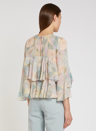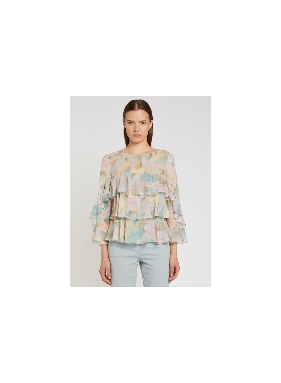 Camicia in georgette di viscosa stampata, fit dritto con rouche e balze, scollo a barchetta firmata MARELLA.