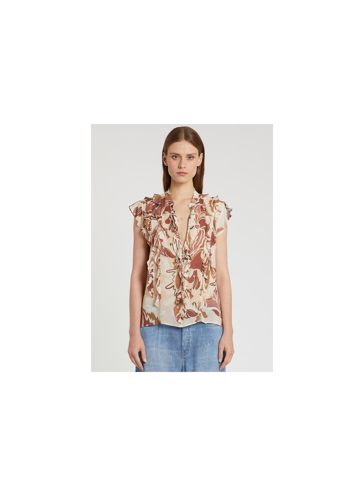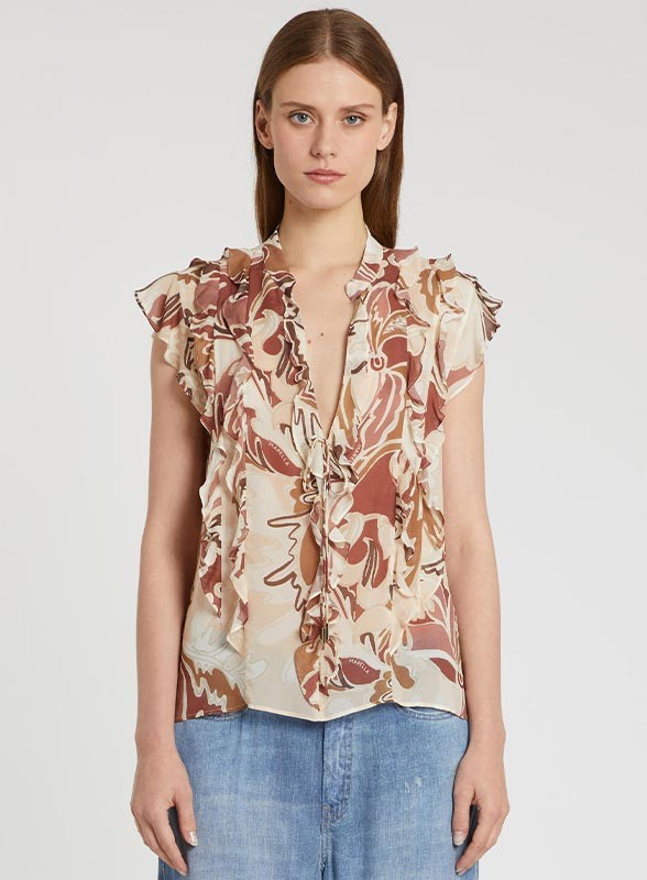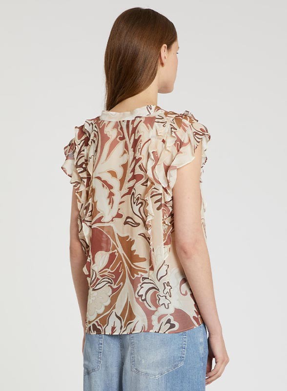 Top firmato MARELLA in viscosa stampata, scollo a V con rouche. Leggero e femminile, perfetto per la bella stagione.