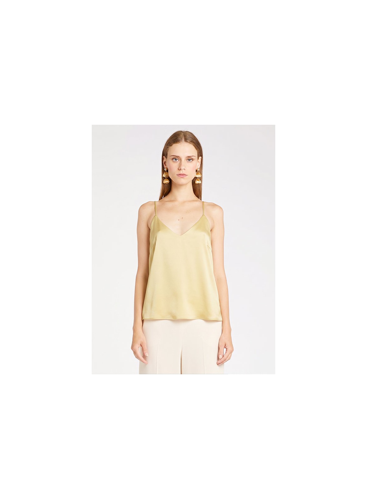 Top firmato MARELLA in satin con scollo a V e spalline sottili. Linea elegante e fit regolare, disponibile rosa e ocra.
