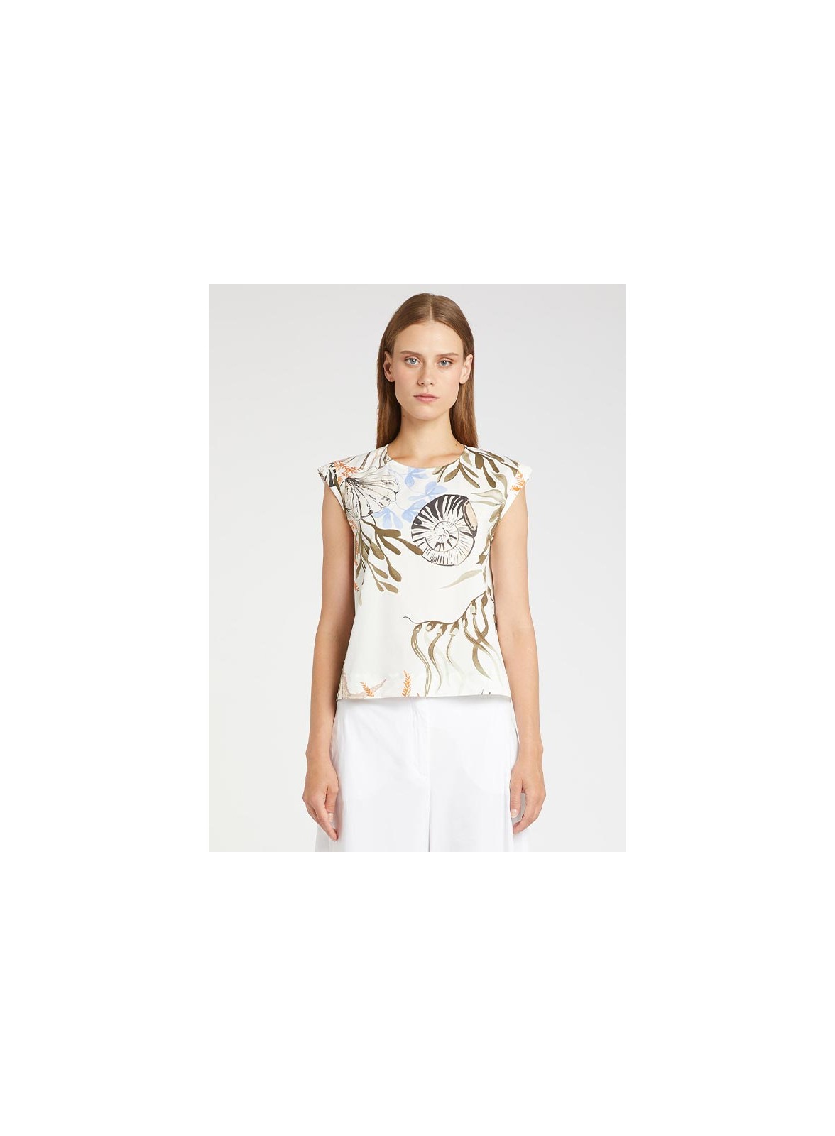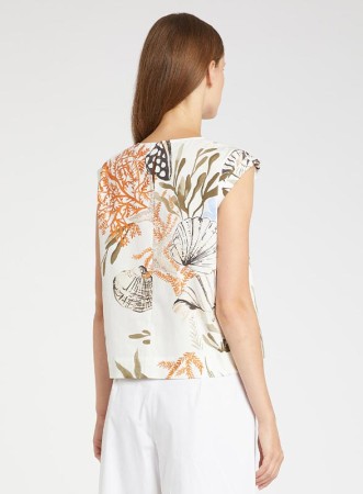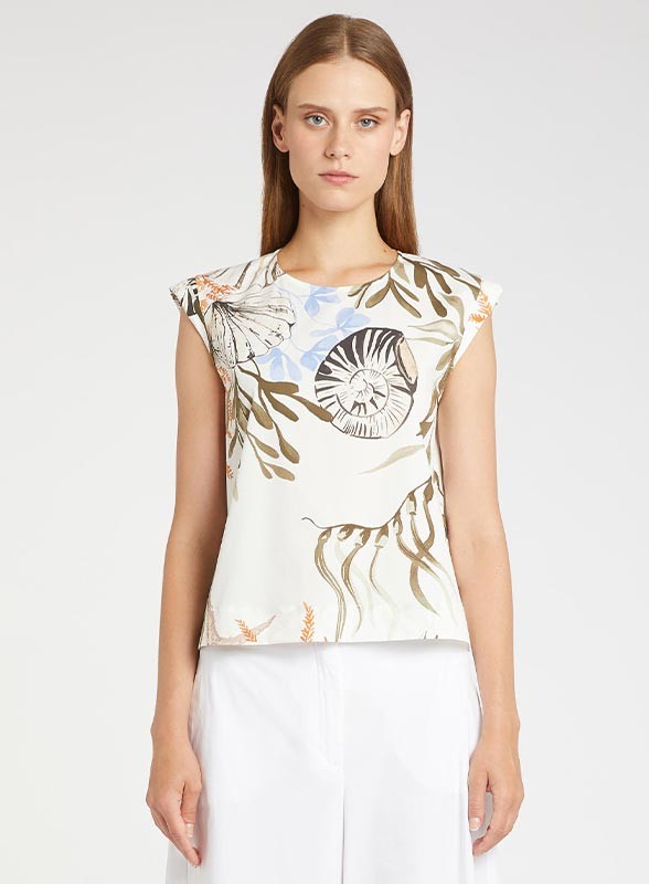 Top firmato MARELLA in popeline di cotone stretch con stampa, scollo stondato e maniche ad aletta, femminile e raffinato.