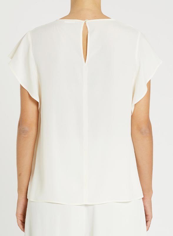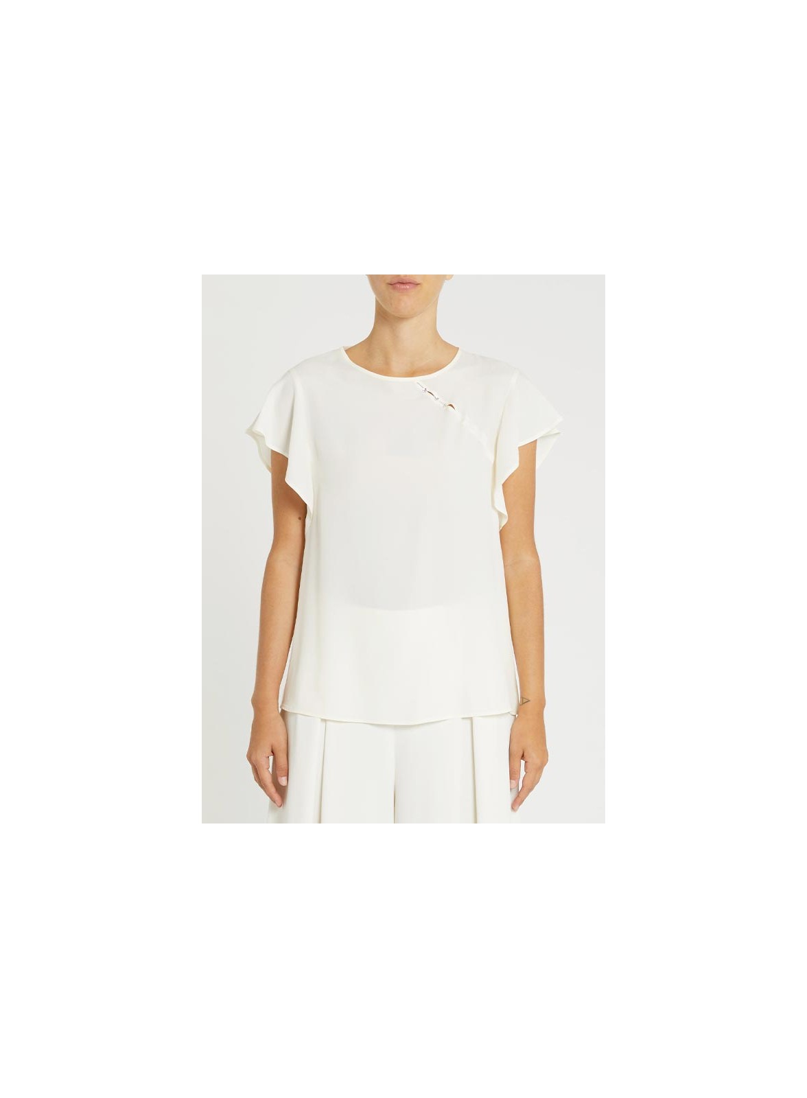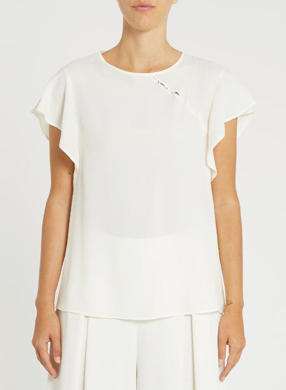 Camicia firmata PENNYBLACK realizzata in raffinato crêpe de Chine con blend di seta, caratterizzata da linee diritte e morbide che valorizzano la silhouette con eleganza. Il girocollo è impreziosito da un originale dettaglio cut-out diagonale sul davanti, che dona un tocco distintivo e moderno. Le maniche corte ad aletta completano il design rendendolo leggero e femminile, mentre l’apertura a goccia con bottoni sul retro aggiunge praticità e raffinatezza al capo.