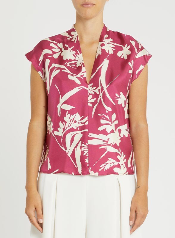 Camicia firmata PENNYBLACK realizzata in pregiato twill di seta, caratterizzata da una texture fluida e luminosa che dona eleganza ad ogni movimento. La stampa a fiori grafici su colore pieno rende il capo distintivo e versatile, ideale sia per occasioni formali che per impreziosire outfit più casual. Il design presenta uno scollo a V sul davanti e un raffinato collo a listino sul retro, mentre le maniche corte a kimono e il taglio diritto garantiscono comfort e vestibilità regolare.