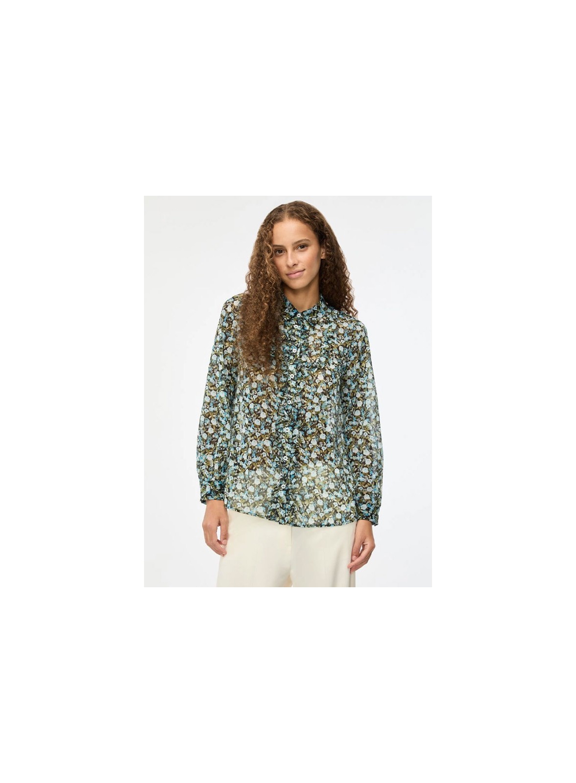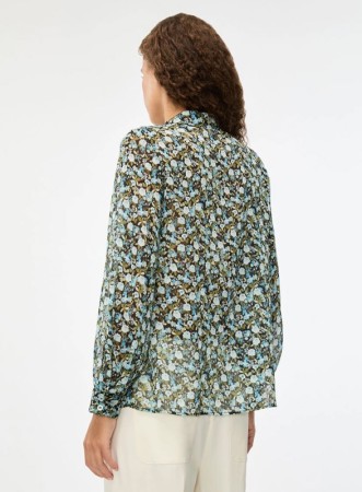 Camicia firmata IBLUES in crêpe stampato dalla linea scivolata, con ruches frontali e fit regolare, perfetta per un look elegante e versatile.