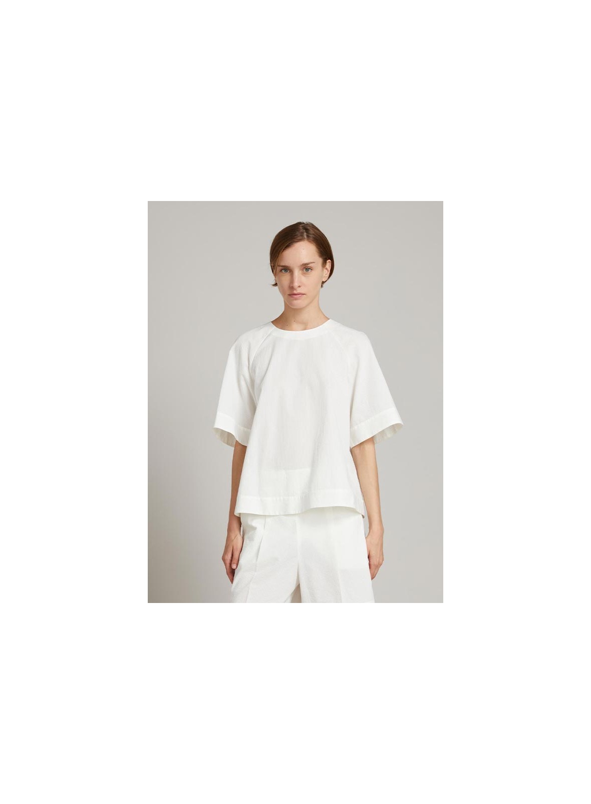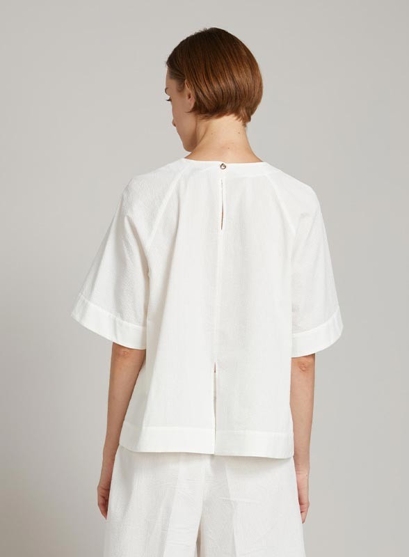 Blusa T-shirt boxy in seersucker di puro cotone, linea svasata e dettaglio con spacco posteriore, firmata MM MaxMara.