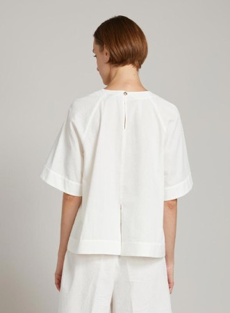 Blusa dal design contemporaneo firmata MM MaxMara, realizzata in leggero seersucker di puro cotone. Il modello presenta una linea svasata dal volume leggermente over che dona comfort e vestibilità fluida. Lo scollo a giro e le ampie maniche raglan valorizzano la silhouette, mentre il profondo spacco combaciato sul retro, che percorre tutta la lunghezza, aggiunge un dettaglio distintivo e sofisticato. La chiusura a goccia con bottone in madreperla sul retro completa il capo con un tocco raffinato.