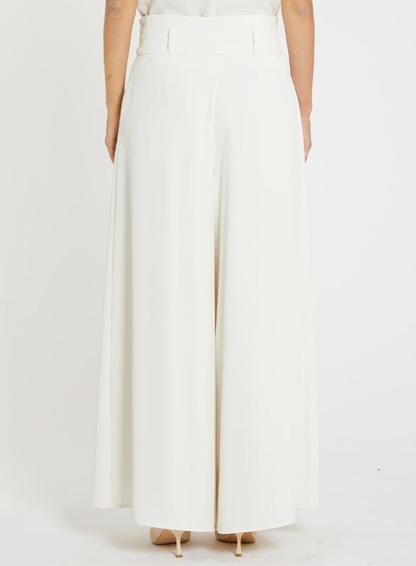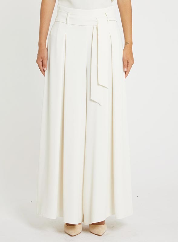 Pantalone firmato PENNYBLACK dallo stile raffinato e contemporaneo, caratterizzato da linee ampie e fluide che valorizzano la silhouette con eleganza. Realizzato in tessuto sablé, si distingue per la gamba svasata e le contropieghe sul davanti che donano movimento e leggerezza ad ogni passo. La vita è rifinita con passanti e una cintura coordinata da annodare, mentre la zip invisibile al fianco garantisce una chiusura discreta e pulita. Ideale per occasioni speciali o per elevare un look quotidiano con un tocco sofisticato.