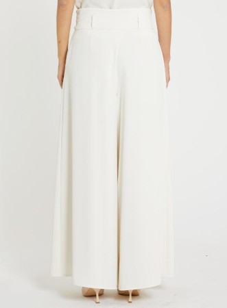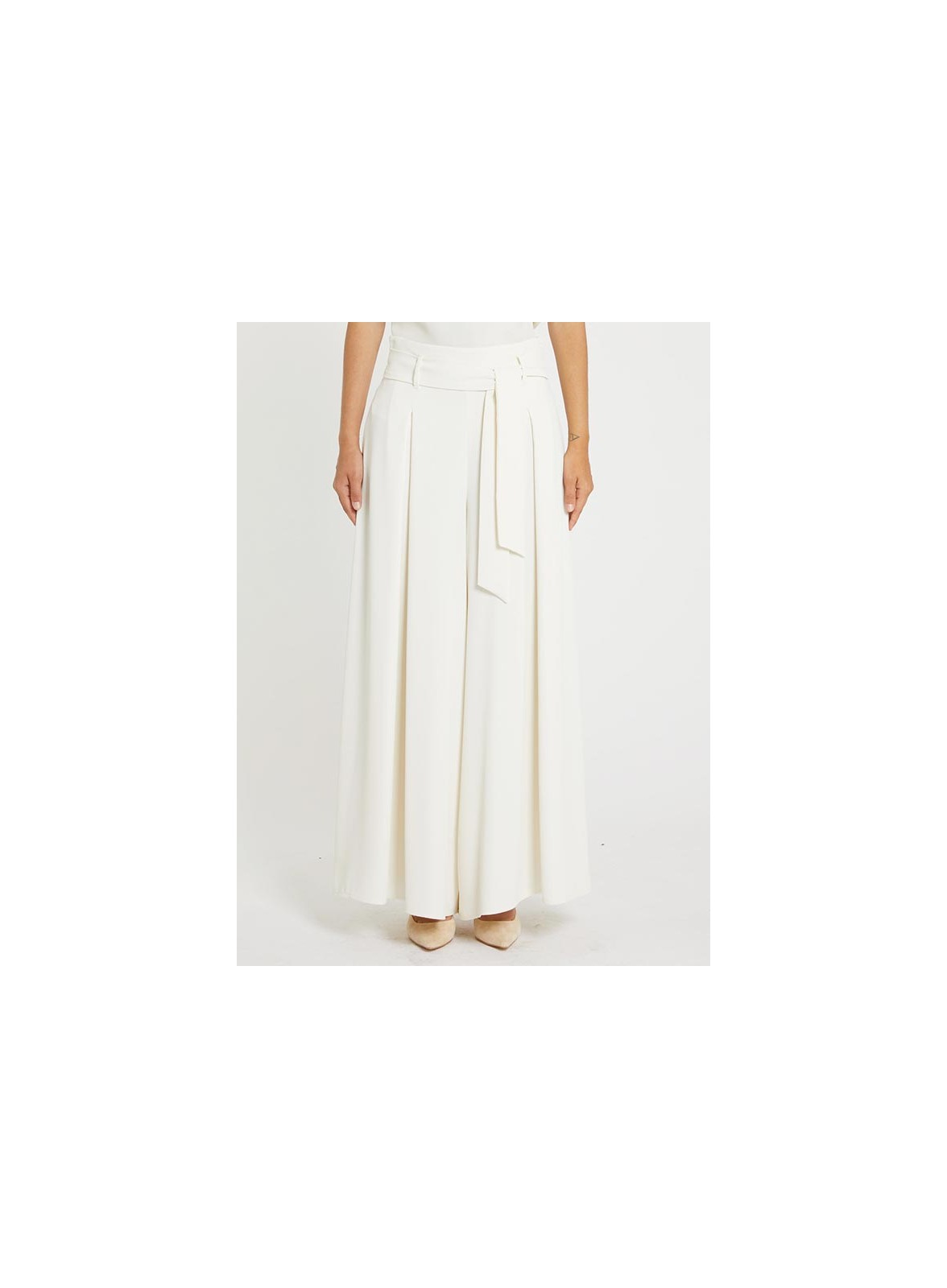 Pantalone firmato PENNYBLACK in tessuto sablé fluido, linea ampia e svasata con contropieghe, perfetto per look eleganti e raffinati.
