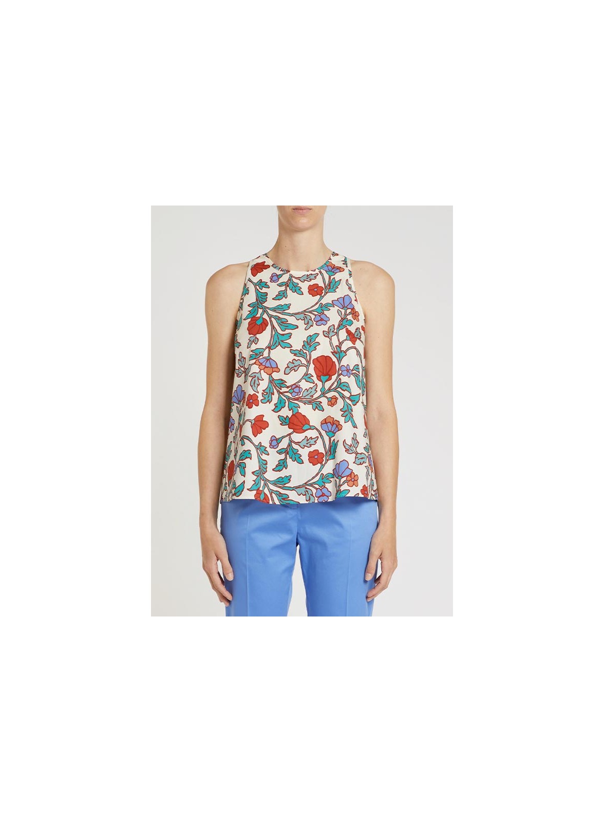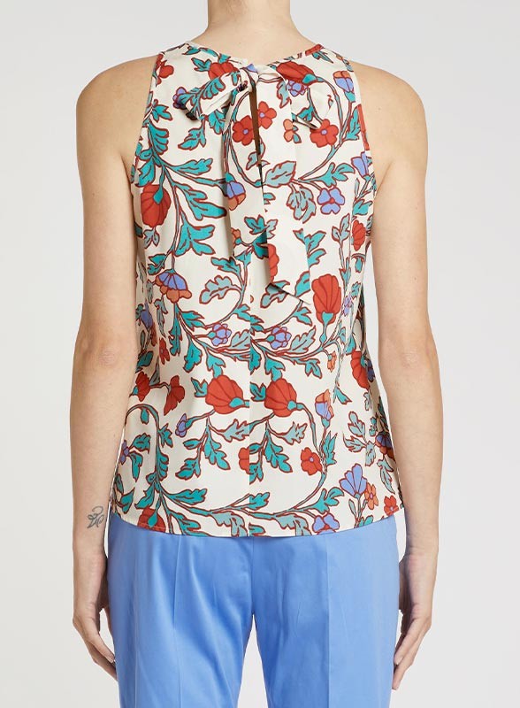 Camicia firmata PENNYBLACK in popeline di cotone, fresca e leggera, con fantasia ramage colorata su fondo bianco, ideale per look estivi eleganti.