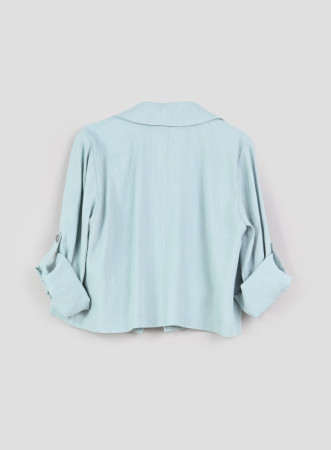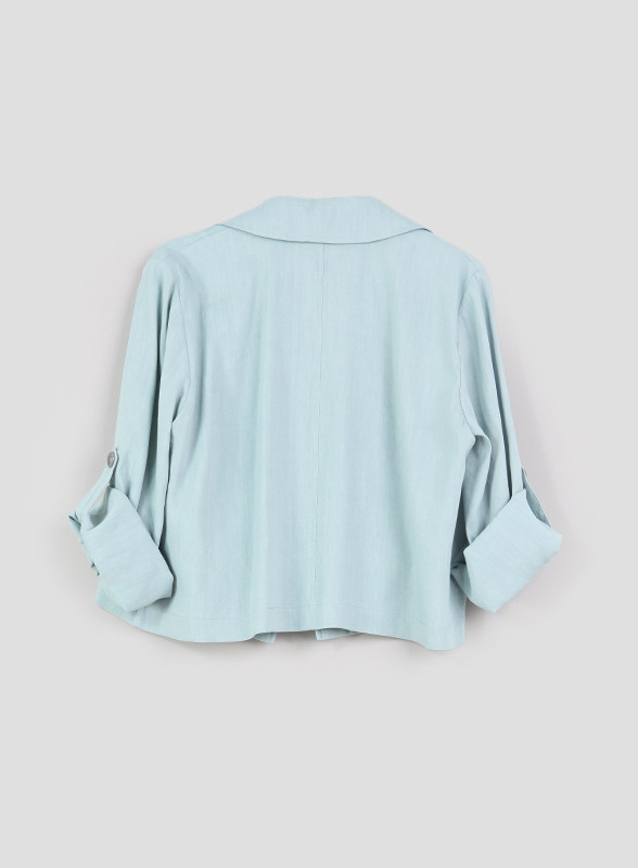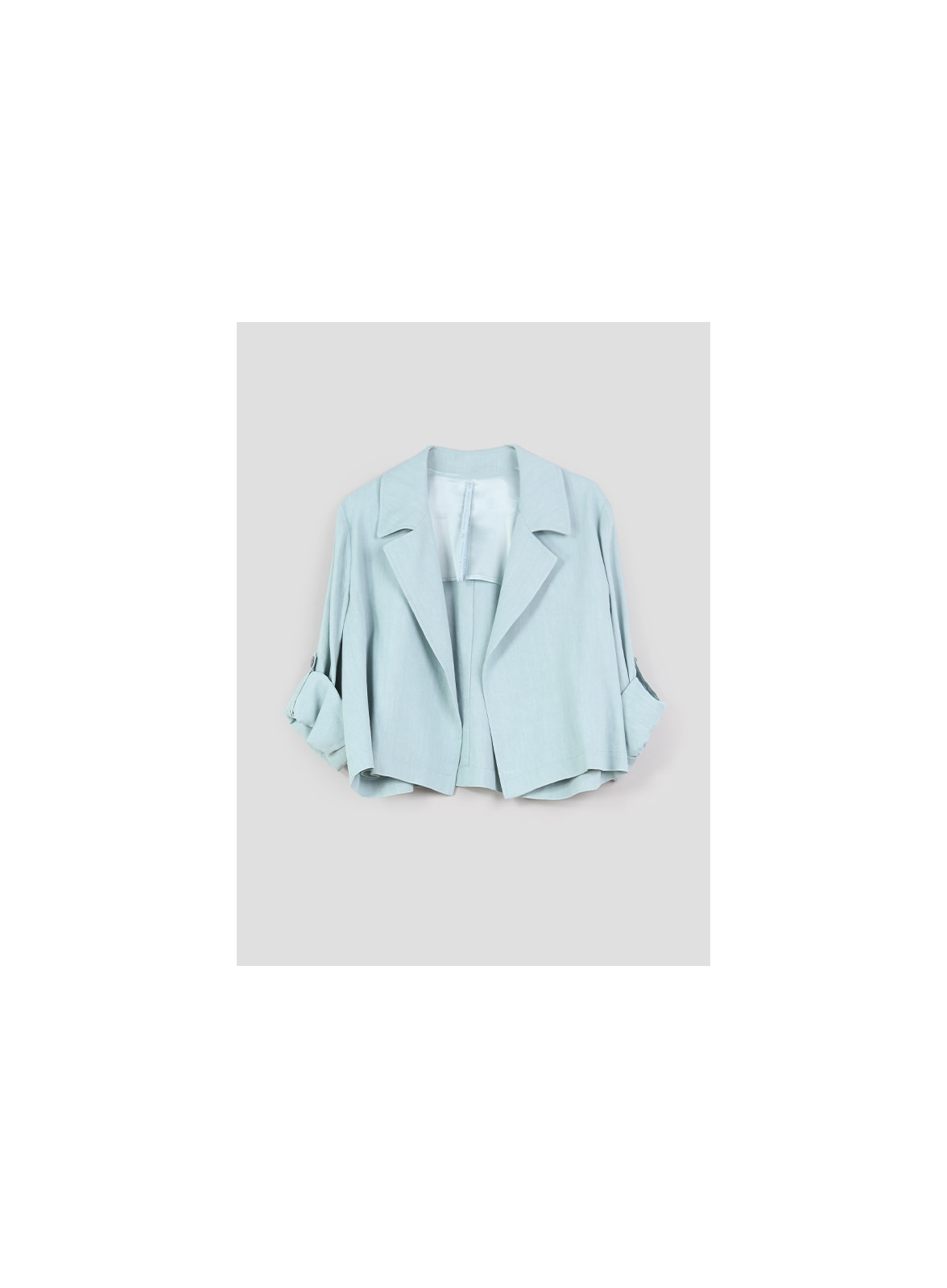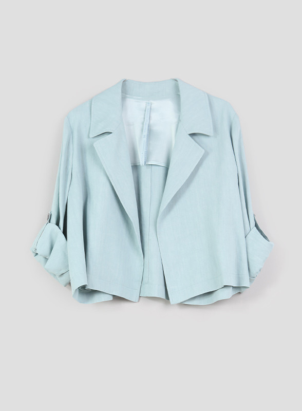 Caratterizzato da una linea fluida e cropped, presenta un collo a rever e maniche scese con alamaro interno per risvolto. La sua silhouette boxy conferisce un'eleganza contemporanea e un tocco di originalità al tuo look. Senza chiusura e sfoderato, è un capo versatile perfetto per aggiungere un tocco di stile a ogni outfit.