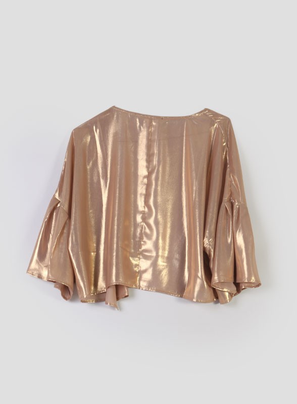 Coprispalle firmato PEPNNYBLACK in georgette laminata, maniche a giro basso e pieghe morbide. Eleganza e stile per i tuoi eventi glam.