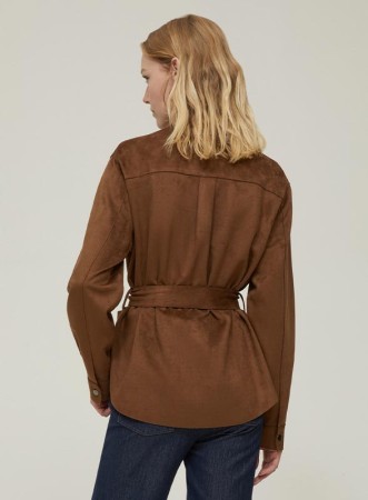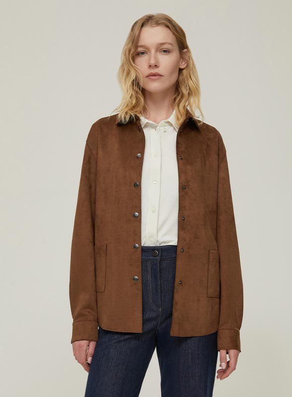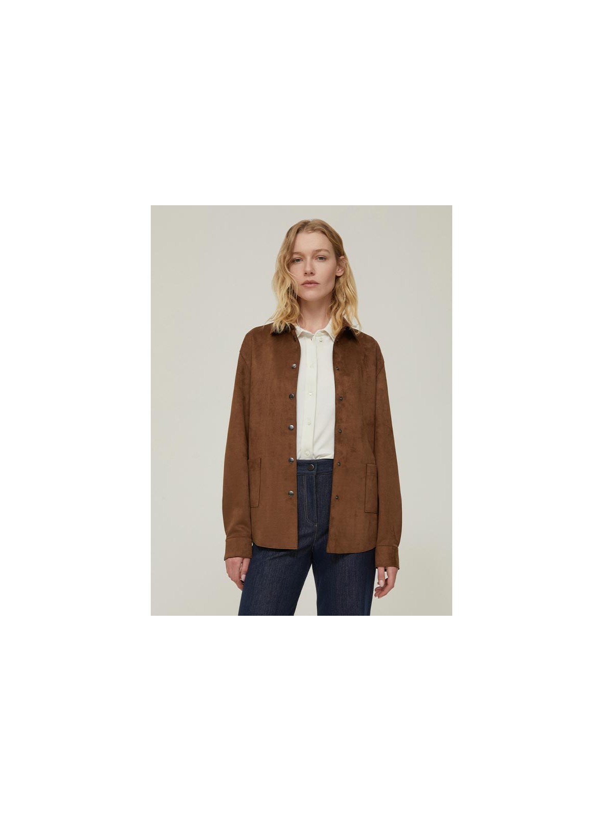 Giaccia camicia firmata PENNYBLACK in jersey stretch vellutato, linee morbide e tasche frontali, versatile e raffinata.