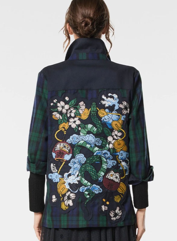 Field Jacket firmata NENETTE in tartan e fresco lana, con ricamo sulla schiena e linea strutturata per un'eleganza contemporanea.