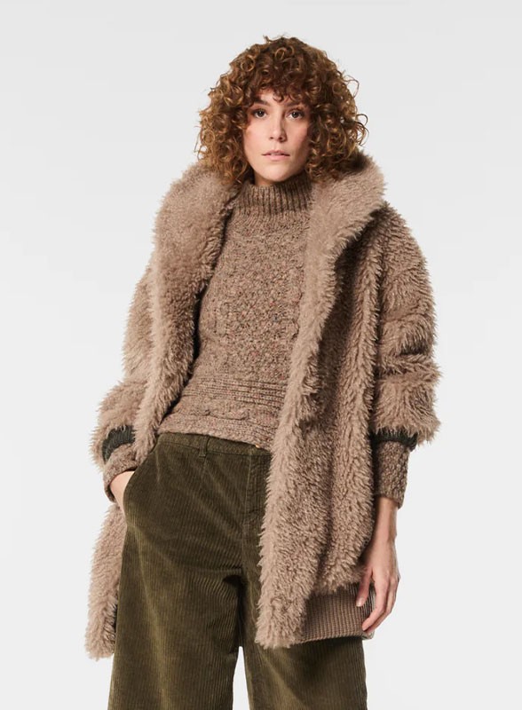 Cappotto firmato NENETTE, un giaccone reversibile che unisce eleganza e praticità. Realizzato in morbido nylon da un lato ed ecopelliccia dall’altro, questo capo offre due diverse interpretazioni di stile in un’unica soluzione. Il design presenta un collo incrociato e una manica lunga rifinita da un polsino in lana arricciato, che conferisce un tocco sofisticato e avvolgente. La chiusura frontale è nascosta con bottoni a pressione per mantenere una linea pulita e raffinata. Sul fondo è impreziosito da un bordo in lana a costine che aggiunge comfort e struttura, mentre le tasche anteriori a patta rendono il capo pratico e funzionale.