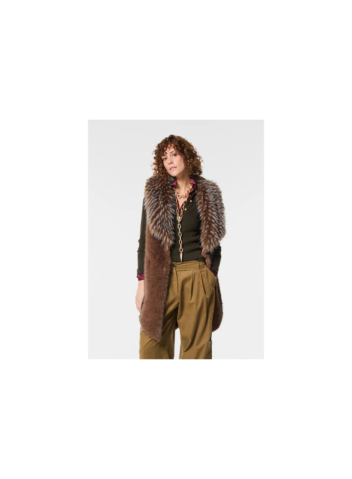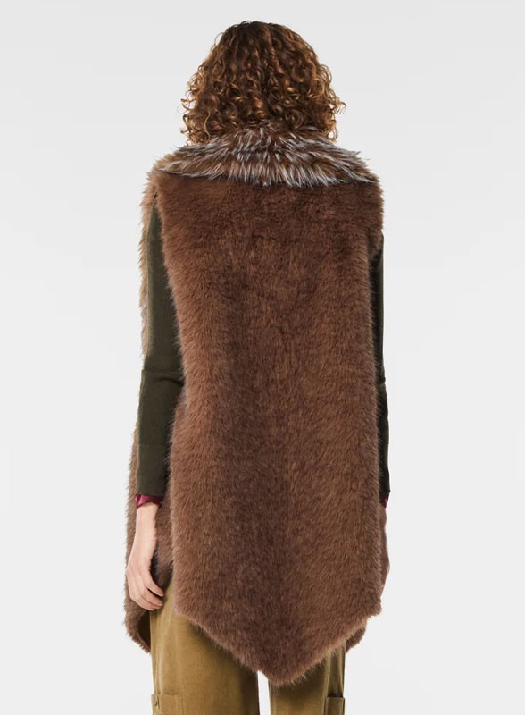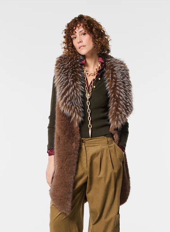 Gilet firmato NENETTE in ecovolpe, linea asimmetrica e fit over. Eleganza e comfort in un capo versatile e raffinato.