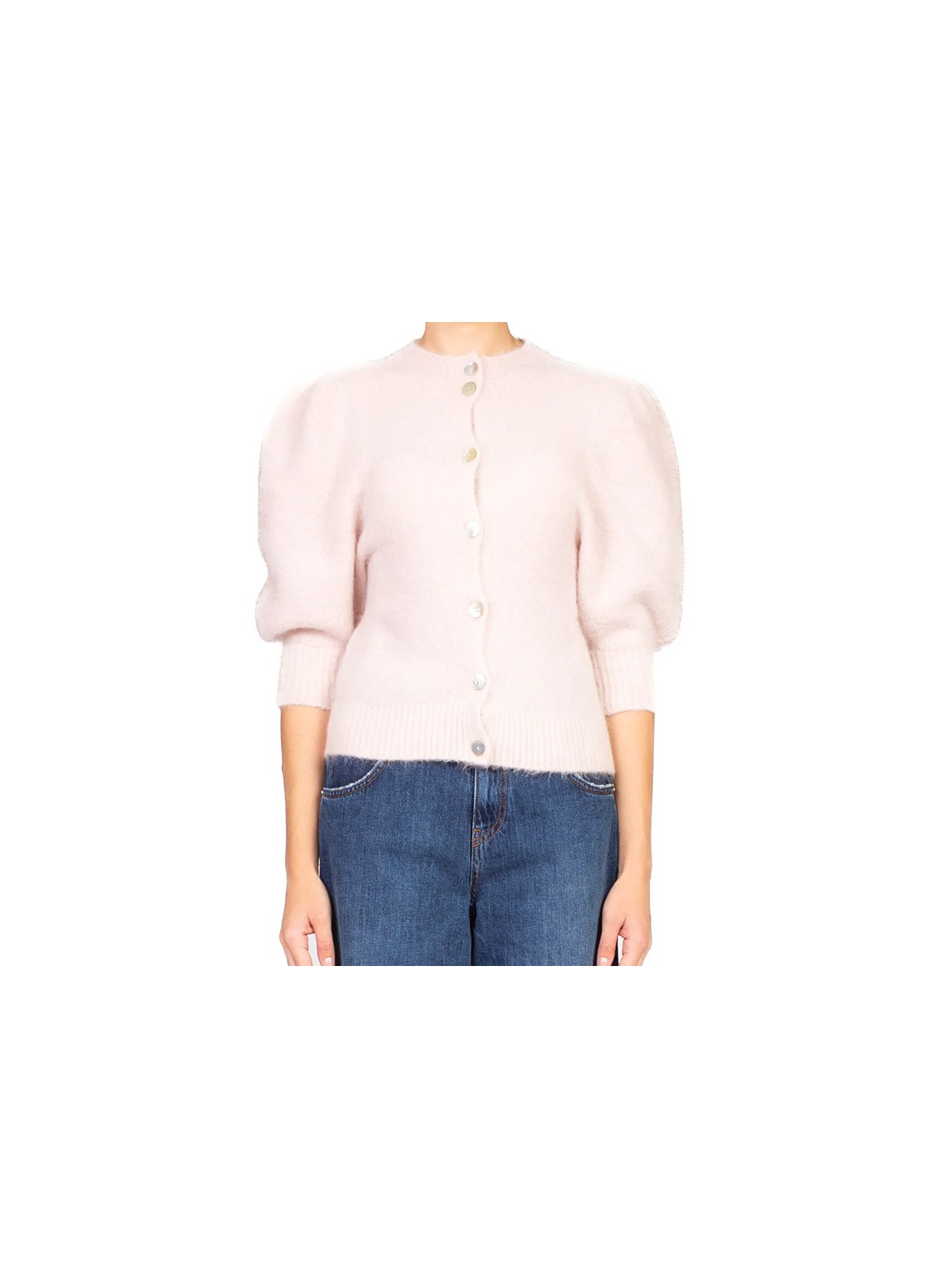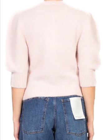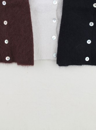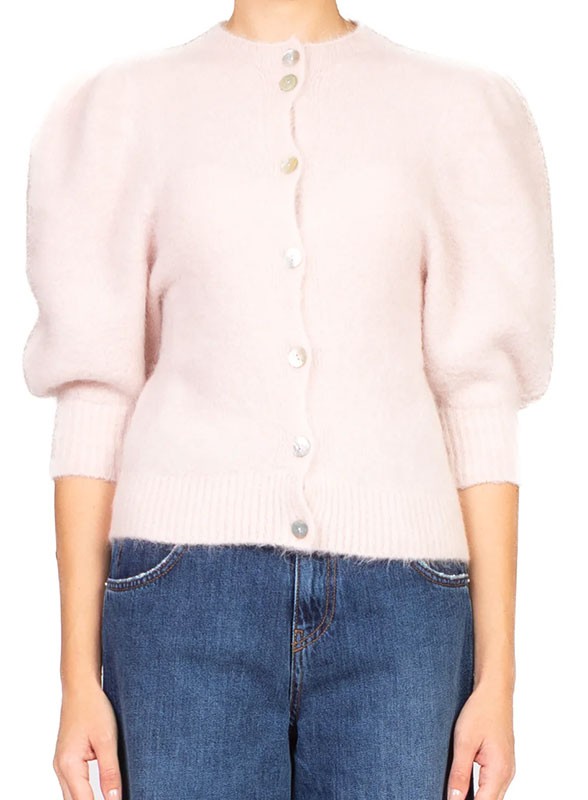 Cardigan firmato KONTATTO in mohair di alpaca, soffice e caldo, con linea regolare e maniche a palloncino, perfetto per look casual o raffinati.