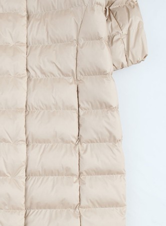 Piumino firmato MM MAXMARA dal taglio dritto, caldo e sostenibile, con cappuccio staccabile e imbottitura mista in lana di cammello e seta.