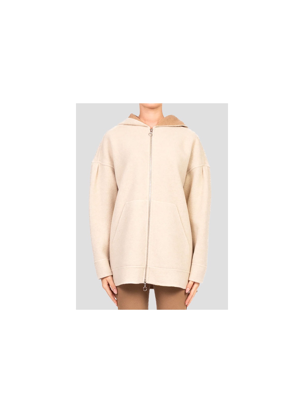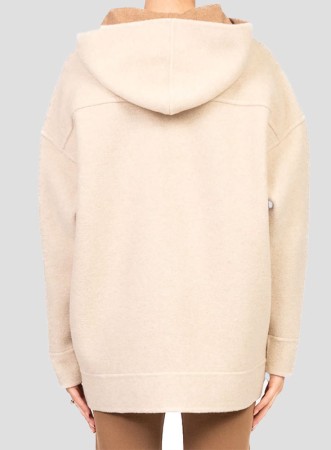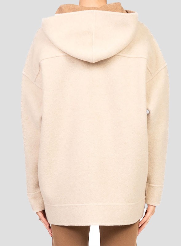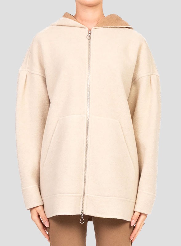 Felpa firmata MM MAXMARA dal fit leggermente over, con cappuccio e zip doppio cursore, perfetta per un look casual ma curato.