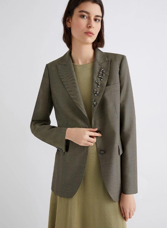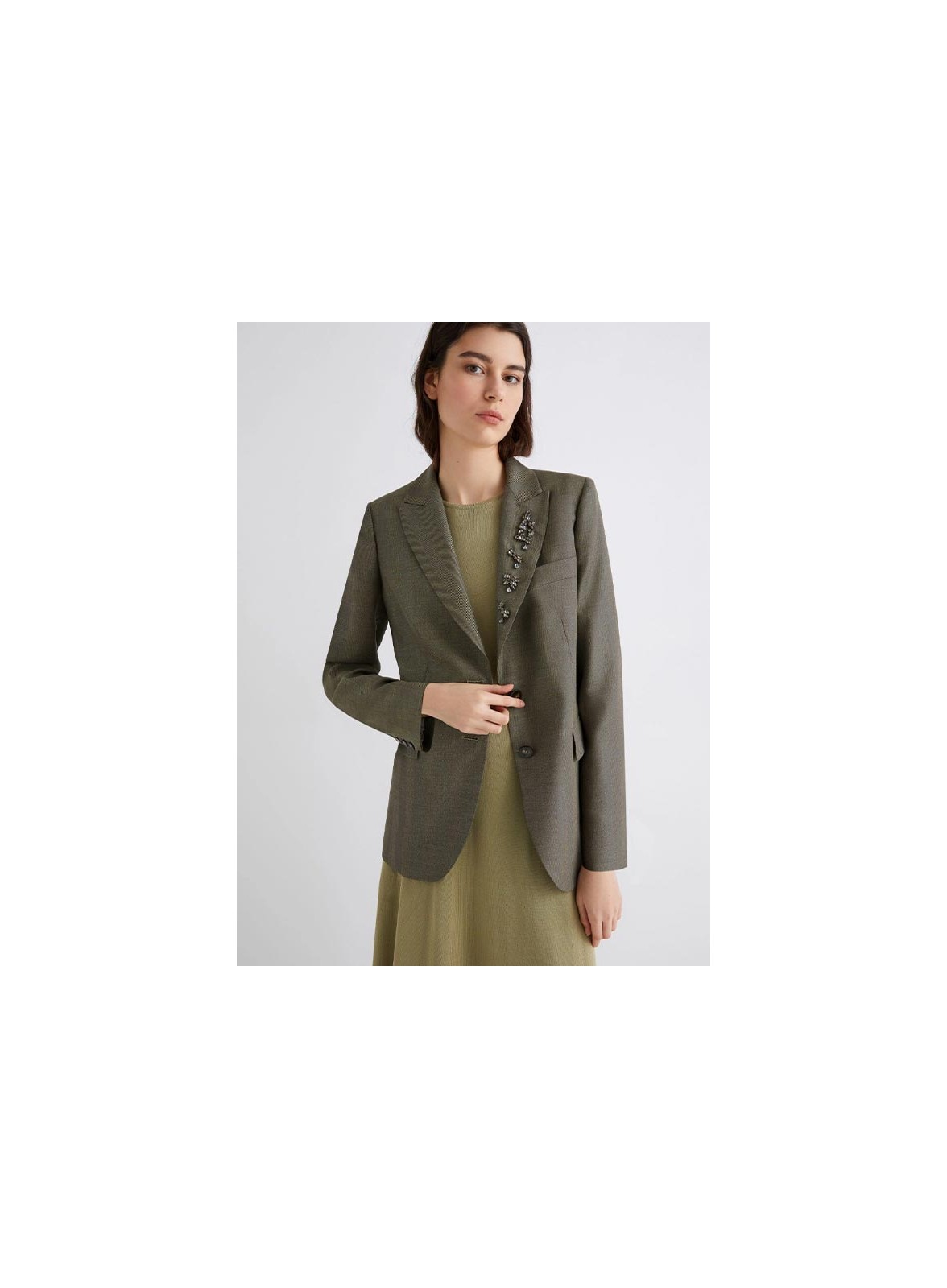 Giacca firmata MARELLA in saglia fluida effetto resca, dal fit femminile con dettagli ricamati in cristalli e linea elegante.