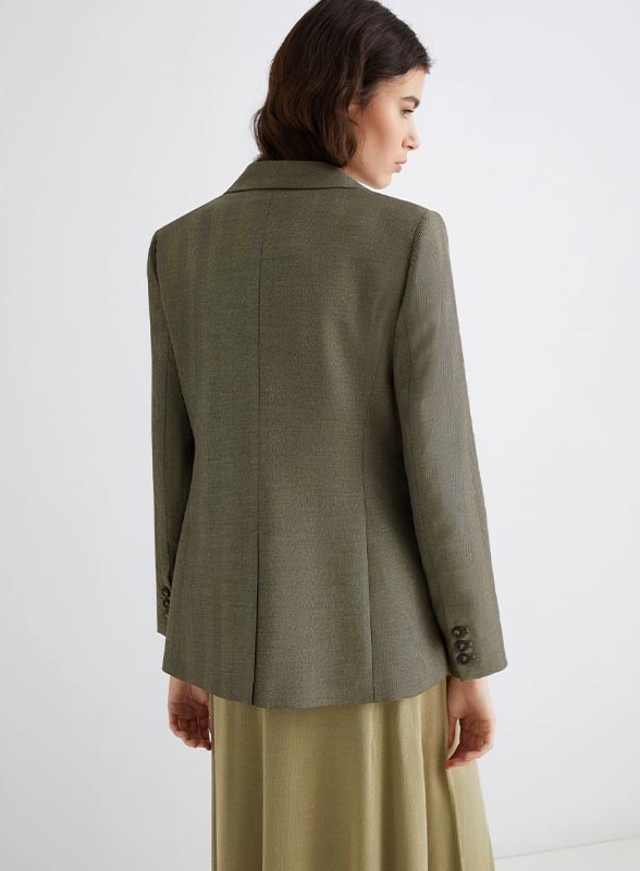 Giacca firmata MARELLA realizzata in saglia fluida effetto resca, un tessuto pregiato che valorizza la silhouette con un fit regolare e molto femminile. Il design presenta uno scollo a rever classico e raffinato, impreziosito da un ornamento con cristalli ricamati che dona un tocco luminoso e sofisticato. Le tasche con patta e filetto aggiungono funzionalità senza rinunciare all’eleganza, mentre lo spacco centrale posteriore assicura libertà di movimento e una vestibilità impeccabile. Le pinces sul davanti definiscono la linea del busto, sottolineando la cura sartoriale che contraddistingue il brand.