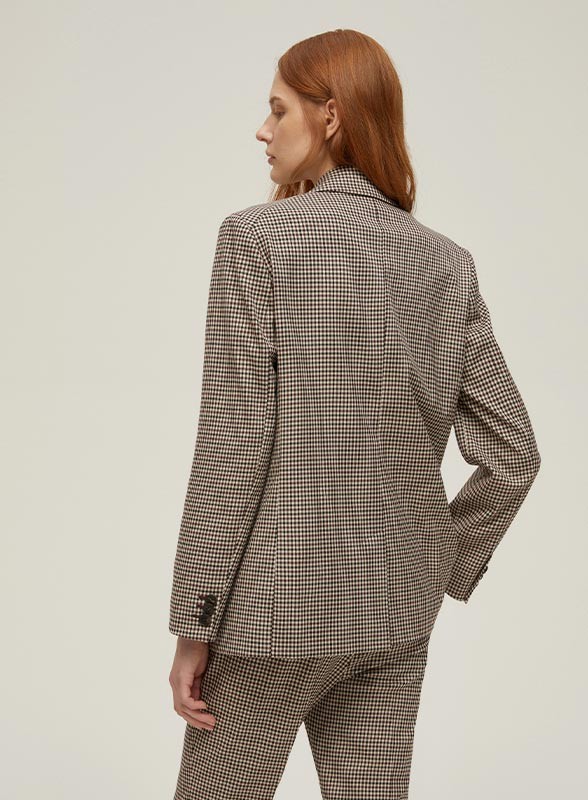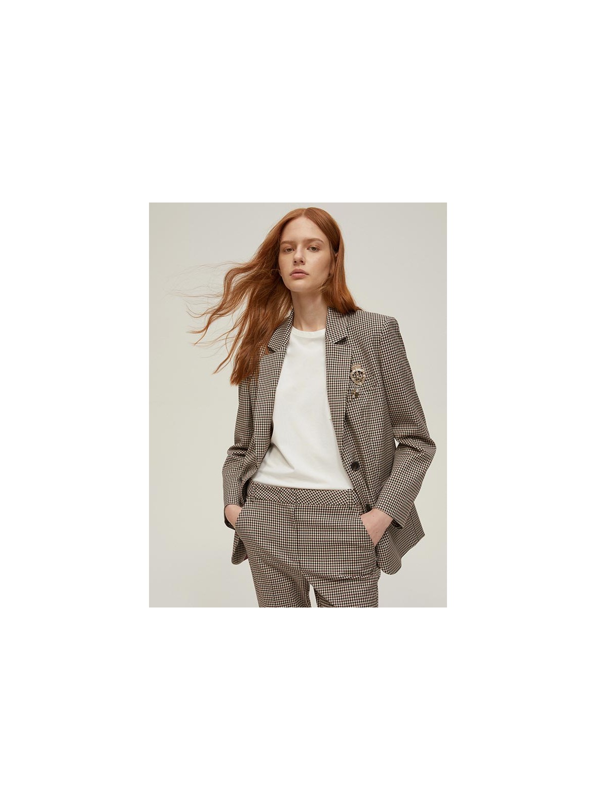 Elegante giacca firmata PENNYBLACK, blazer monopetto a quadretti in viscosa stretch con rever classico e spille staccabili.