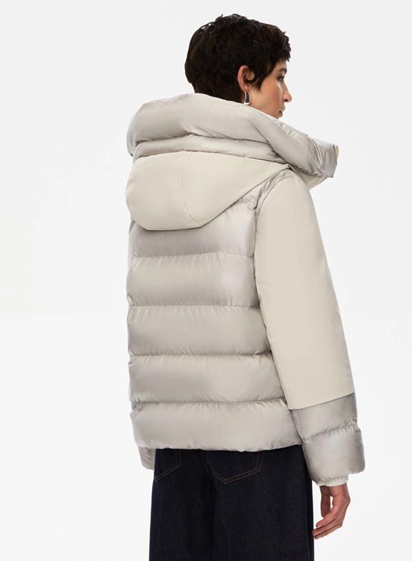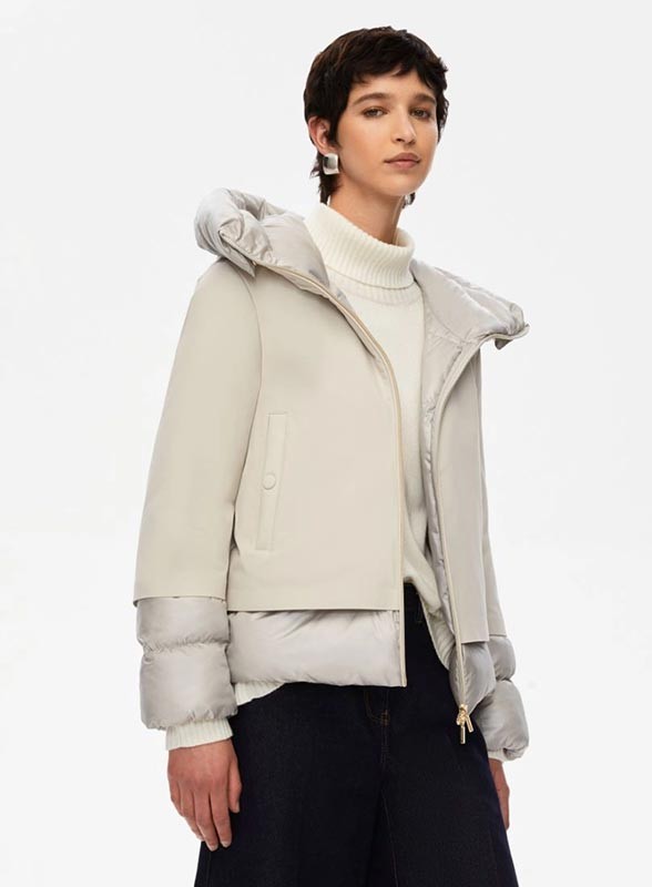 Piumino firmato IBLUES in tela antigoccia, linea svasata e cappuccio ampio. Design tecnico e femminile con fit regolare e stile layered.