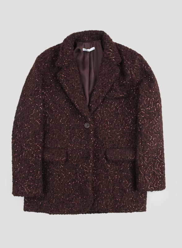 Giacca firmata IMPERIAL dal taglio dritto con micropaillettes in tinta, foderata e versatile, ideale per look metropolitani eleganti e contemporanei.