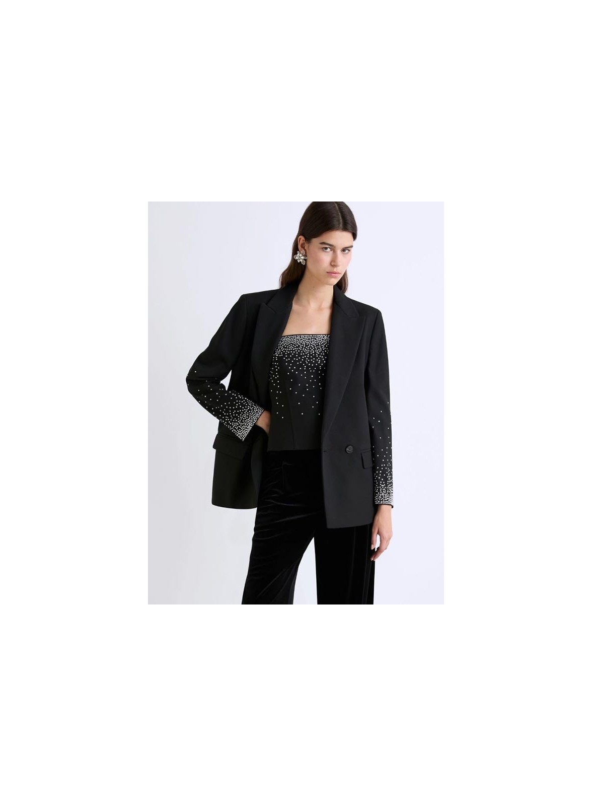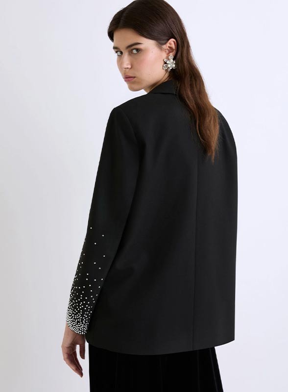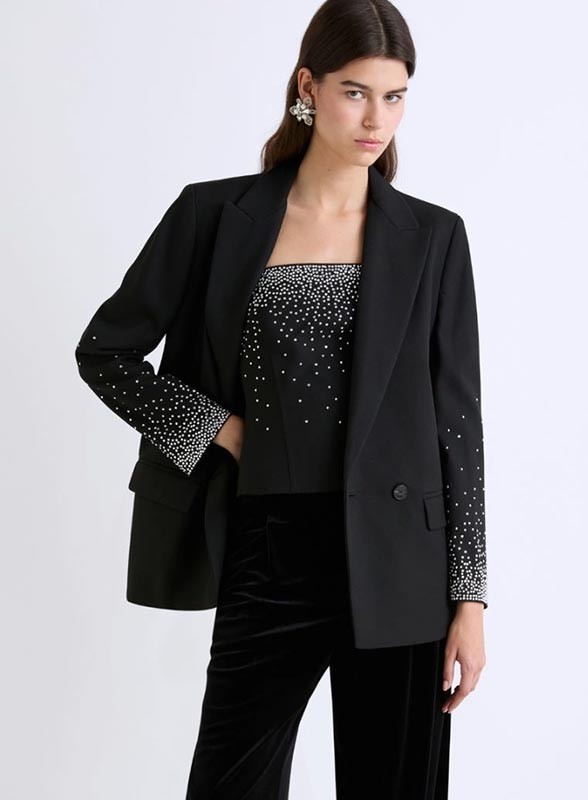 Giacca blazer firmata MARELLA dal design elegante e contemporaneo, realizzata in diagonale di misto viscosa stretch per garantire comfort e una vestibilità fluida sul corpo. Il modello presenta scollo con rever e chiusura doppiopetto a due bottoni, elemento iconico che dona carattere e struttura al capo. Il fit è dritto, ideale per valorizzare la silhouette con uno stile raffinato ma versatile. Le tasche laterali con patta e doppio filetto completano il design sartoriale. A rendere questa giacca ancora più esclusiva sono i cristalli applicati sul fondo manica, disposti in un elegante disegno dégradé che illumina il look. Perfetta da indossare sia di giorno che di sera, per outfit formali o più ricercati.