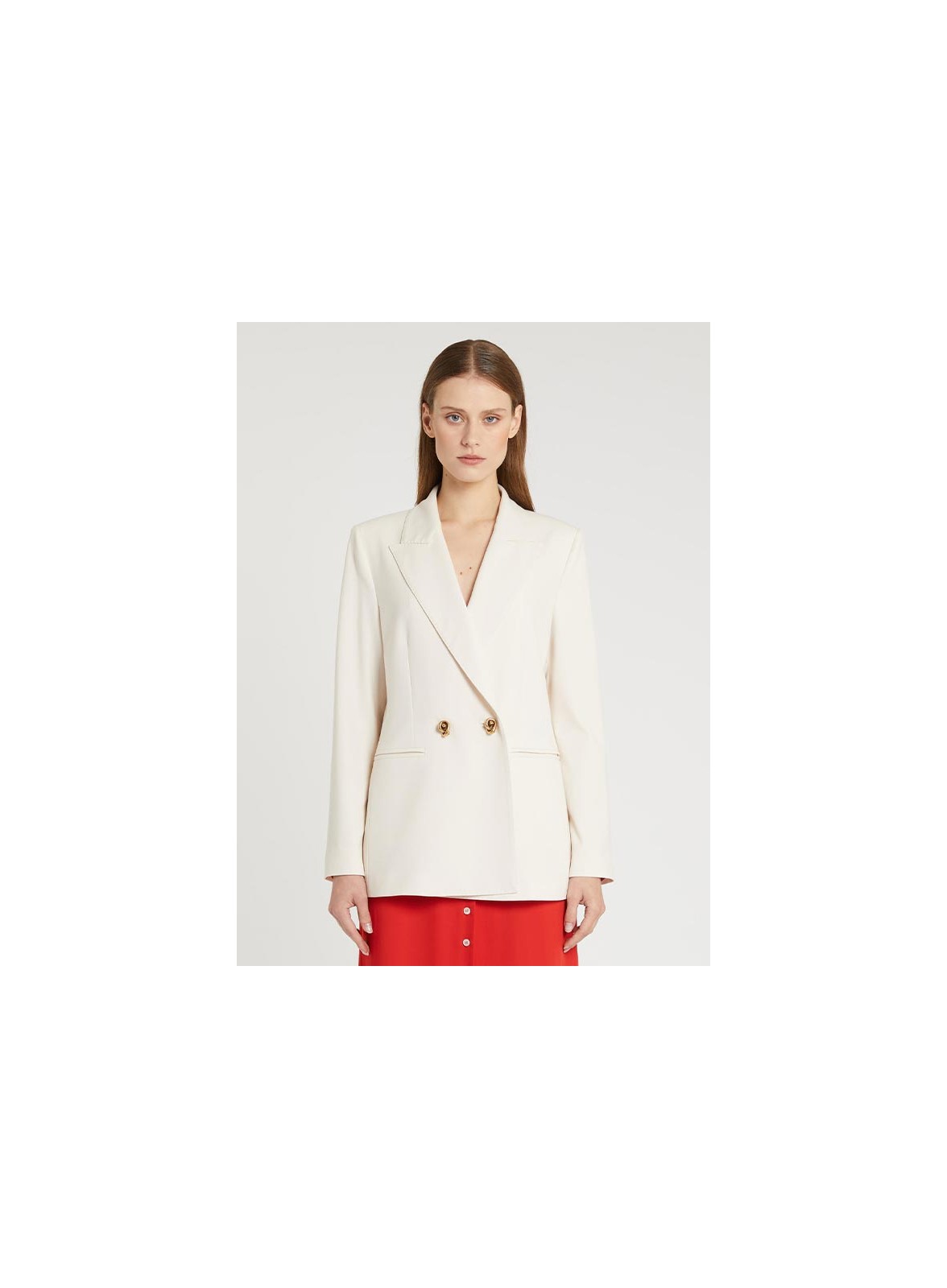 Giacca blazer in tela bistretch dal taglio sartoriale e dalle linee maschili, firmata MARELLA. Il design è caratterizzato da scollo con rever, chiusura doppiopetto con bottoni metallici a nodo e tasche laterali a filetto. Il fit regolare valorizza la silhouette con eleganza contemporanea, rendendola perfetta sia per look formali che per abbinamenti più casual. Il tessuto principale contiene una percentuale di poliestere riciclato superiore al 50%, per uno stile attento anche alla sostenibilità.