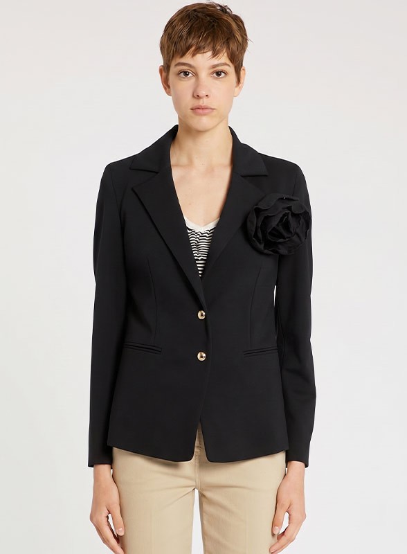 Giacca firmata MARELLA Sport nera, fit aderente in jersey misto viscosa stretch con spilla floreale rimovibile.