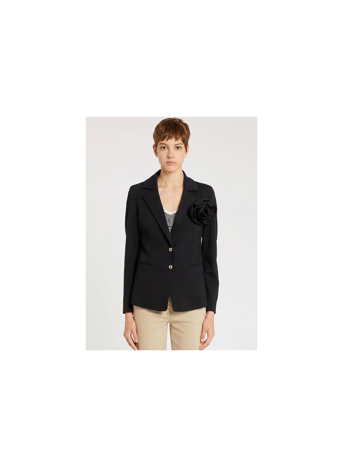 Giacca firmata MARELLA, modello Sport blazer dalla linea aderente realizzata in jersey di misto viscosa stretch lavorato a punto milano con fodera interna. Lo scollo è con rever e la chiusura è con bottoni a vista. Il design è completato da una spilla rimovibile con macro fiore in tessuto che dona un tocco distintivo e femminile. Le tasche sono a filetto e il fit aderente valorizza la silhouette. Il tessuto principale contiene materie prime derivanti dalla cellulosa del legno, fibra ricavata nel rispetto del patrimonio forestale. Questo capo fa parte della collezione MARELLA Sport.