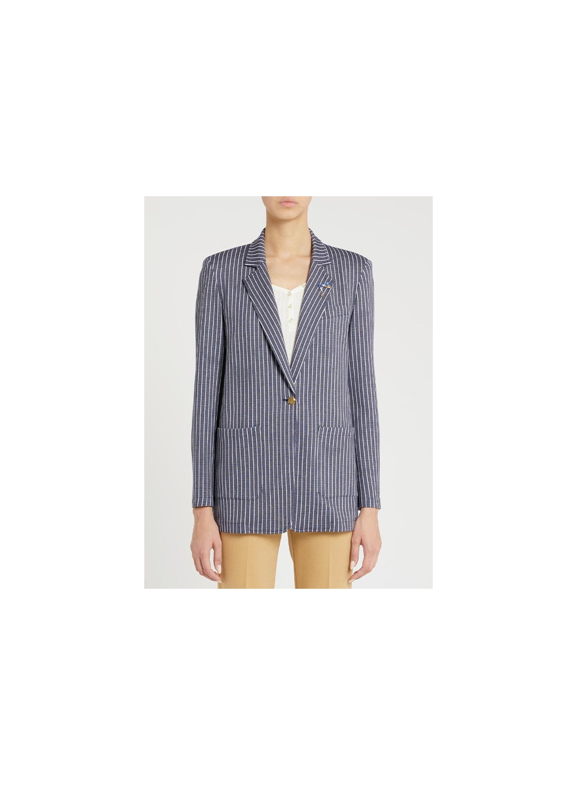 Giacca firmata PENNYBLACK che unisce eleganza e praticità in un capo versatile e contemporaneo. Realizzata in jersey stretch, reinterpreta il classico motivo gessato con una lavorazione jacquard raffinata. Il taglio diritto, monopetto a un bottone, valorizza la silhouette mantenendo un fit regolare e confortevole. Le spalle strutturate e il collo a revers con spille staccabili aggiungono carattere e personalità al capo. Completano il design il taschino a filo, le tasche applicate frontali e il bottone in metallo con stemma. Capo sfoderato, ideale per un look dinamico e moderno, perfetto sia per l’ufficio che per il tempo libero. Disponibili in collezione anche i pantaloni coordinati per un completo impeccabile.