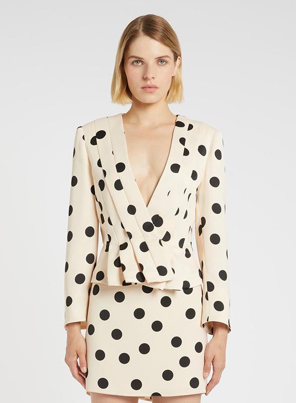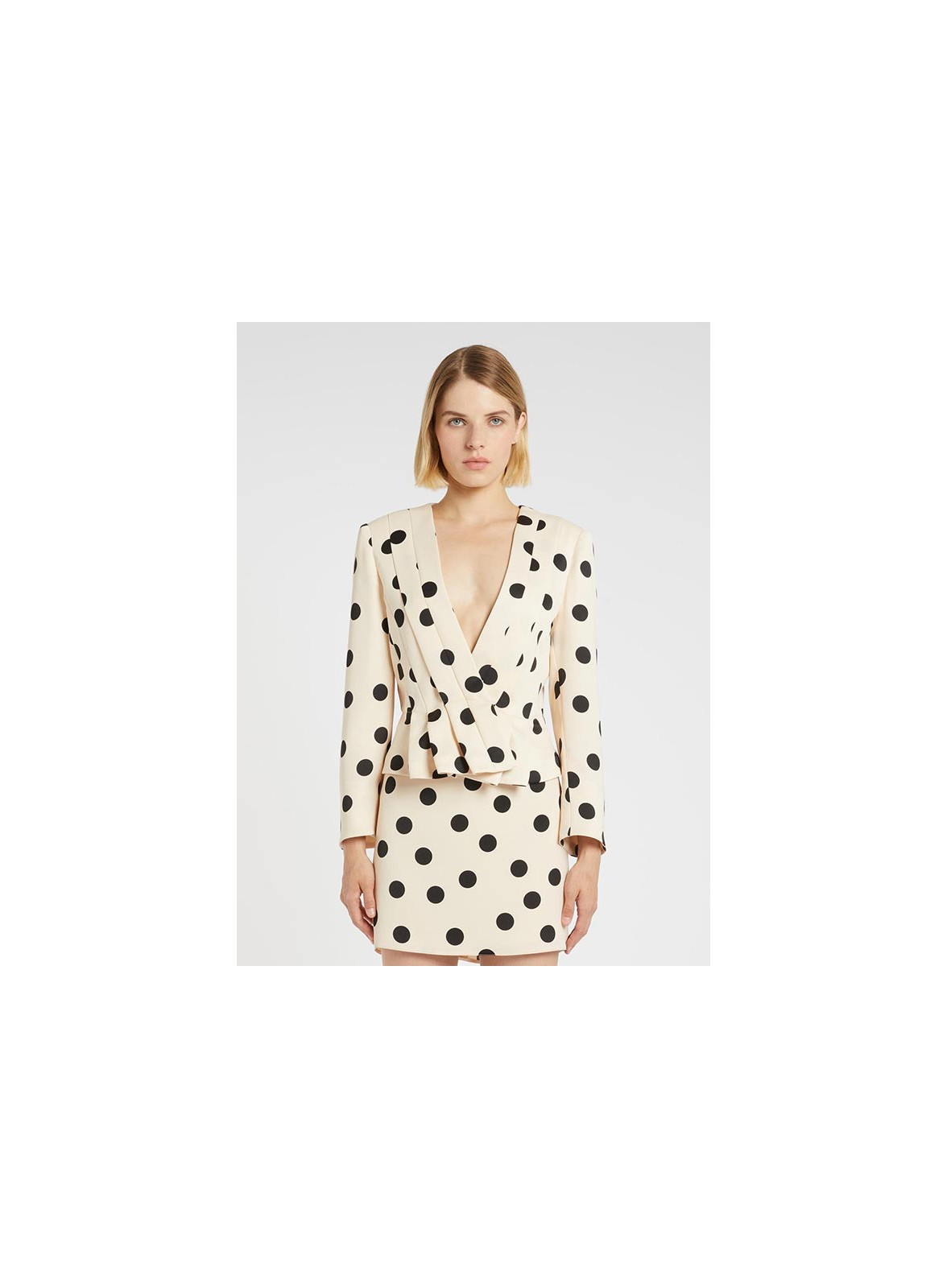 Giacca in satin firmata MARELLA, fit aderente con pieghe sullo scollo a V e design sagomato che valorizza la silhouette con eleganza.