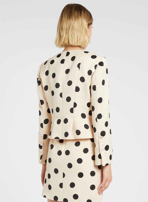 Giacca in satin firmata MARELLA dal design sofisticato e contemporaneo. Il modello, corto sotto la vita, presenta un fit aderente che esalta la silhouette grazie ai fianchetti sagomati e ai tagli sul retro. Lo scollo a V è valorizzato da un elegante gioco di pieghe incrociate sul davanti, che dona movimento e carattere al capo. La chiusura con bottoni a pressione nascosti mantiene una linea pulita e minimale, mentre la fodera interna garantisce comfort e vestibilità.