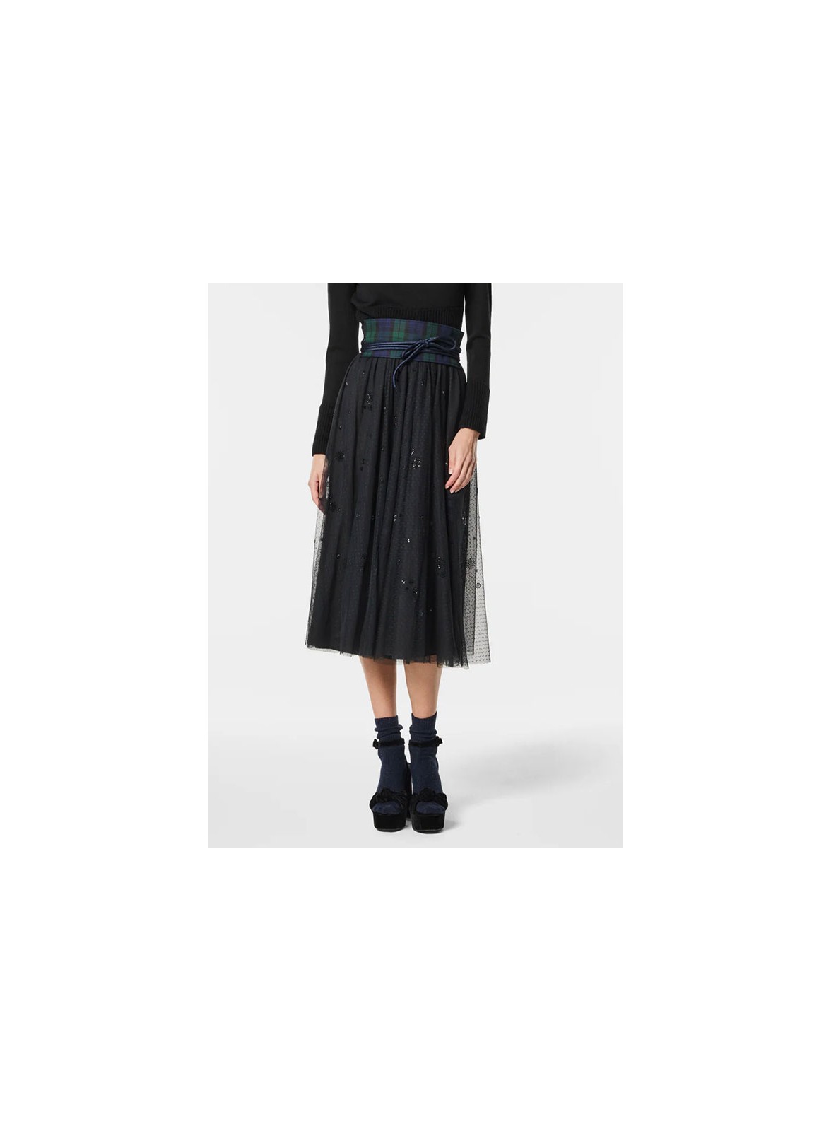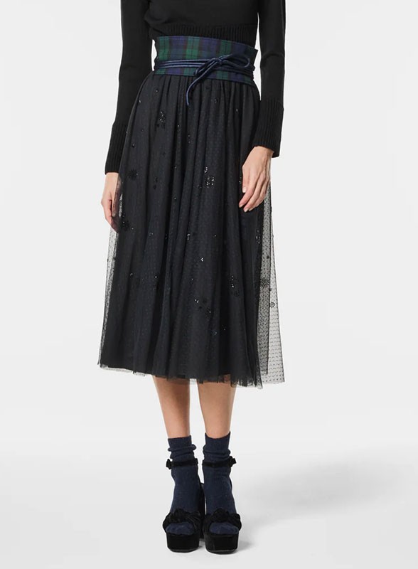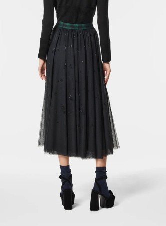 Gonna lunga firmata NENETTE, in plumetis con inserti in paillettes, elegante e raffinata per look sofisticati e femminili.