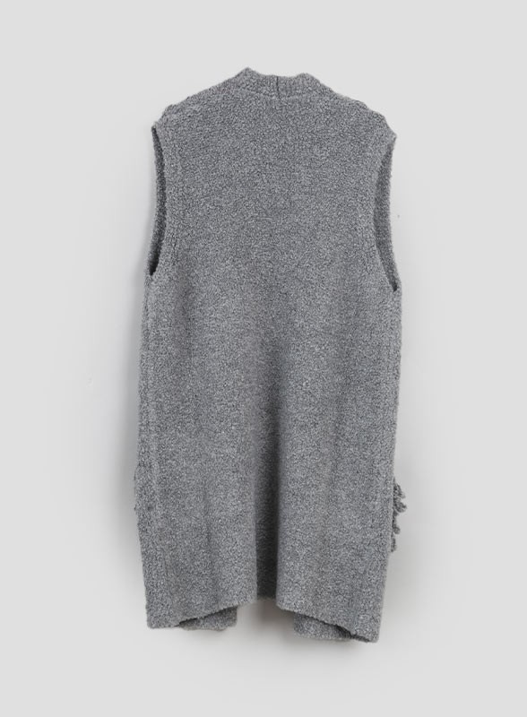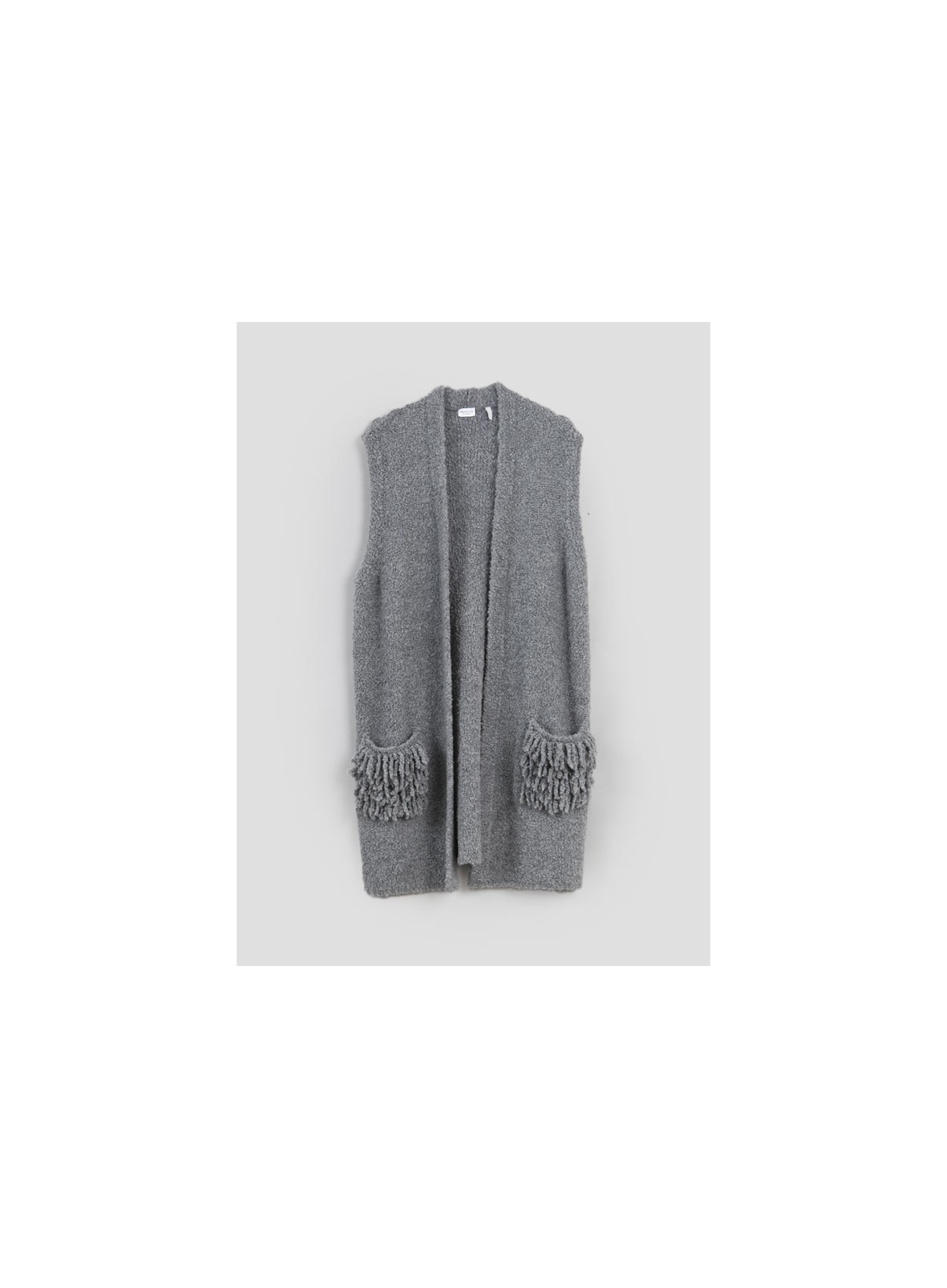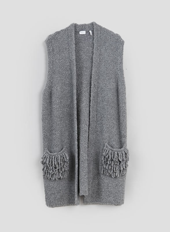 Gilet firmato MARELLA, in misto lana bouclè dalla linea oversize con tasche applicate con frange. Ideale per i primi freddi autunalli e per essere sempre al passo con le nuove tendenze moda.